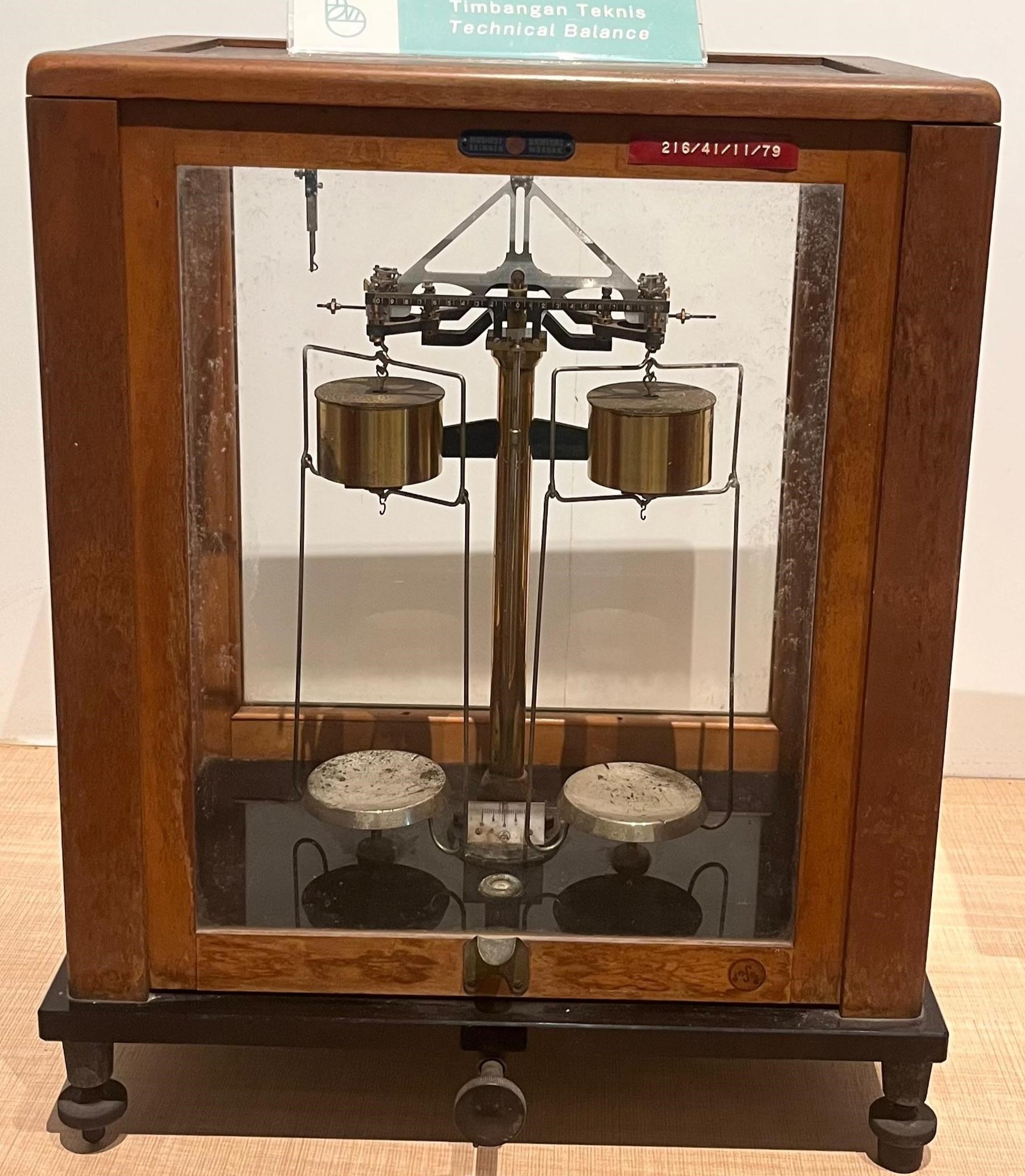 Timbangan teknis (technical balance) atau sering juga disebut neraca analitik (analytical balance). Ini adalah jenis timbangan yang dahulu digunakan oleh peneliti Bio Farma untuk mengukur massa dengan tingkat presisi tinggi, menimbang zat atau bahan dengan akurasi sub-miligram. Timbangan yang ada di gambar adalah model klasik dengan penutup kaca untuk melindungi dari gangguan lingkungan seperti debu dan angin, yang dapat mempengaruhi akurasi pengukuran.