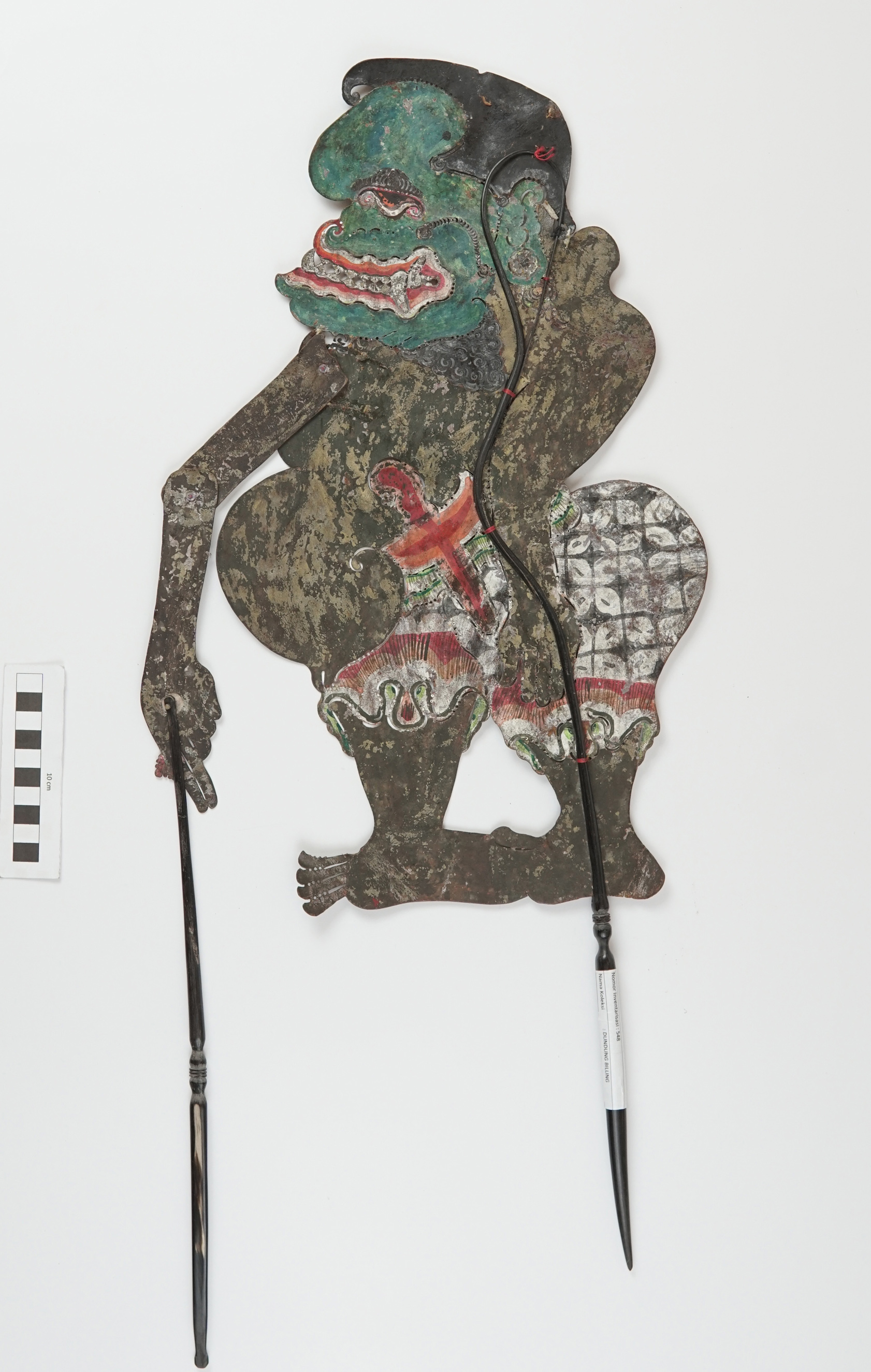 Bahan : KULIT Teknik : Tatahan Warna : Biru Dekorasi : Sunggingan Ornamen : Sabuk, Dodot Tanda tanda : Bindeng (sengau) Asesori : Keris Fungsi : Buta repat Simbol : Lucu Arti : (-) Gaya : Gemagus Kelengkapan : Satu Set Wayang Purwa Banyumas