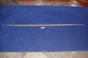Bentuk bilah pipih meruncing ke depan. Hulu silindrik berlubang bundar, tembus pada kedua ujung benda sebagai lubang sumpit. Terdapat logam yang digulung menyerupai sulur. Fungsinya sebagai pembidik sasaran. Hiasan berupa simpai atau anyaman rotan yang berfungsi pula sebagai pengikat bilah tombak dan alat bidik. Simpai lain berukuran kecil sebagai ornamen tambahan. Selain digunakan sebagai senjata pertahanan diri, juga digunakan untuk keperluan berburu binatang.