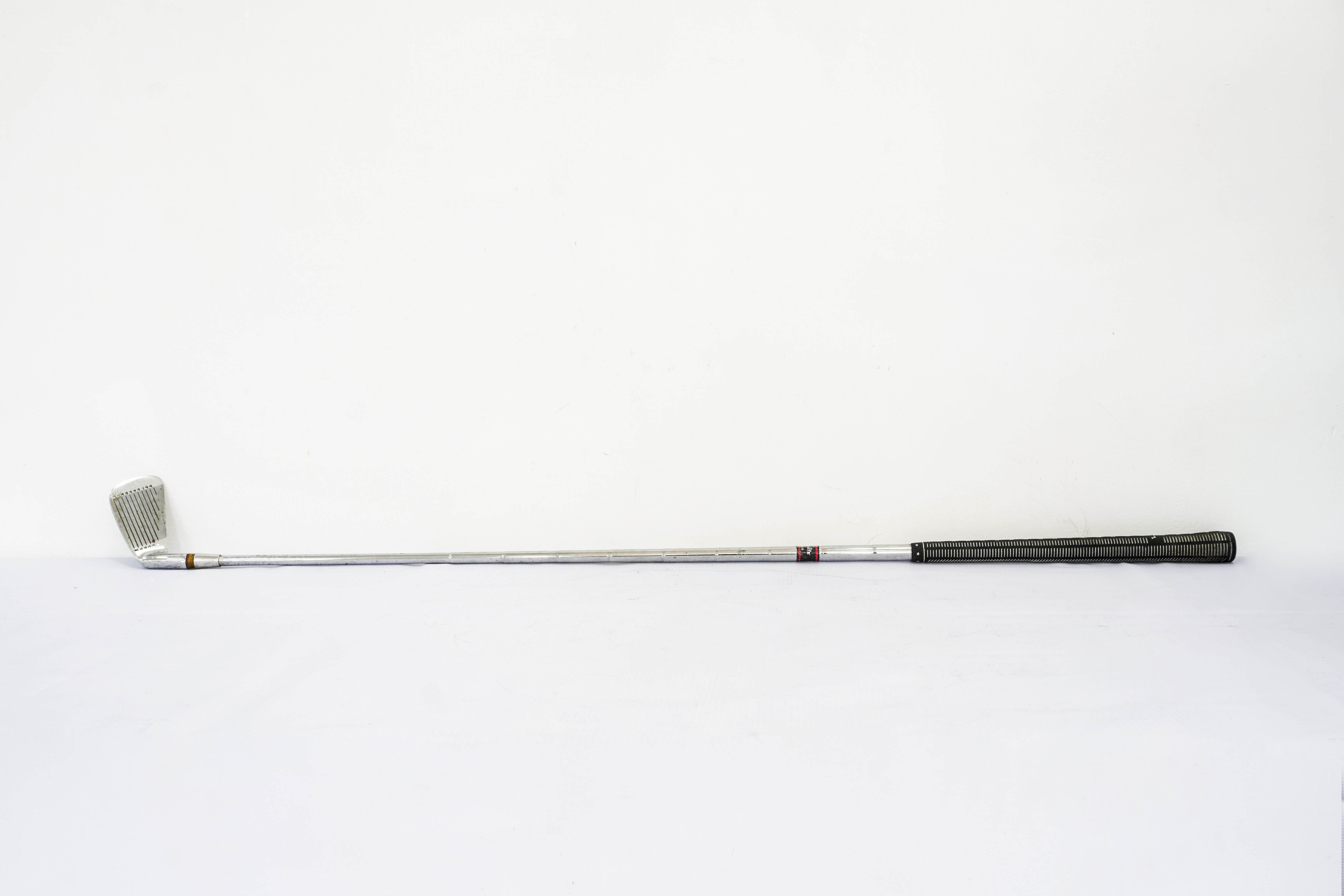 Koleksi ini berupa tongkat golf dengan batang panjang berbahan logam berwarna perak. Pegangan dilapisi karet hitam berpola garis untuk memperkuat cengkeraman tangan. Ujung bawah berbentuk kepala pemukul datar dengan permukaan lebar berwarna perak mengilap, menunjukkan fungsi sebagai stik tipe iron. Batang logam ramping dengan sambungan halus antara kepala pemukul dan pegangan. Kondisi tongkat masih utuh, meski terdapat goresan halus dan sedikit karat pada bagian logam akibat penggunaan dan usia.