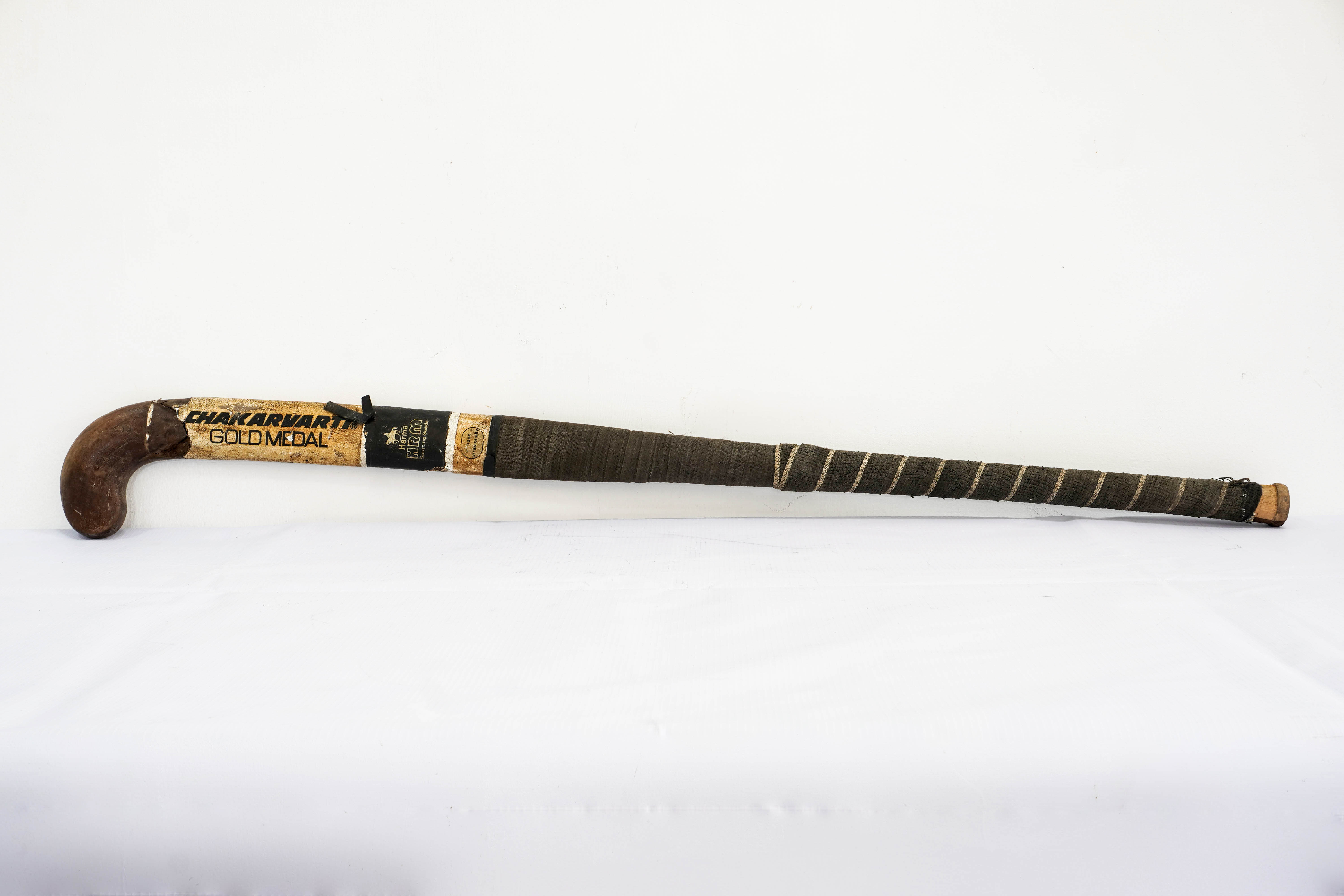 Koleksi ini berupa stik hockey dengan bentuk memanjang lurus dan ujung melengkung membulat. Bahan utama kayu berwarna cokelat tua dengan permukaan yang sudah aus akibat penggunaan. Bagian pegangan dilapisi balutan kain hitam dengan pola lilitan spiral berwarna terang. Pada batang terdapat label tempel berwarna kuning dengan tulisan serta ornamen berbentuk belah ketupat berwarna merah-hijau. Kondisi fisik menunjukkan goresan dan perubahan warna pada kayu, sementara lapisan kain sudah tampak longgar di beberapa bagian.