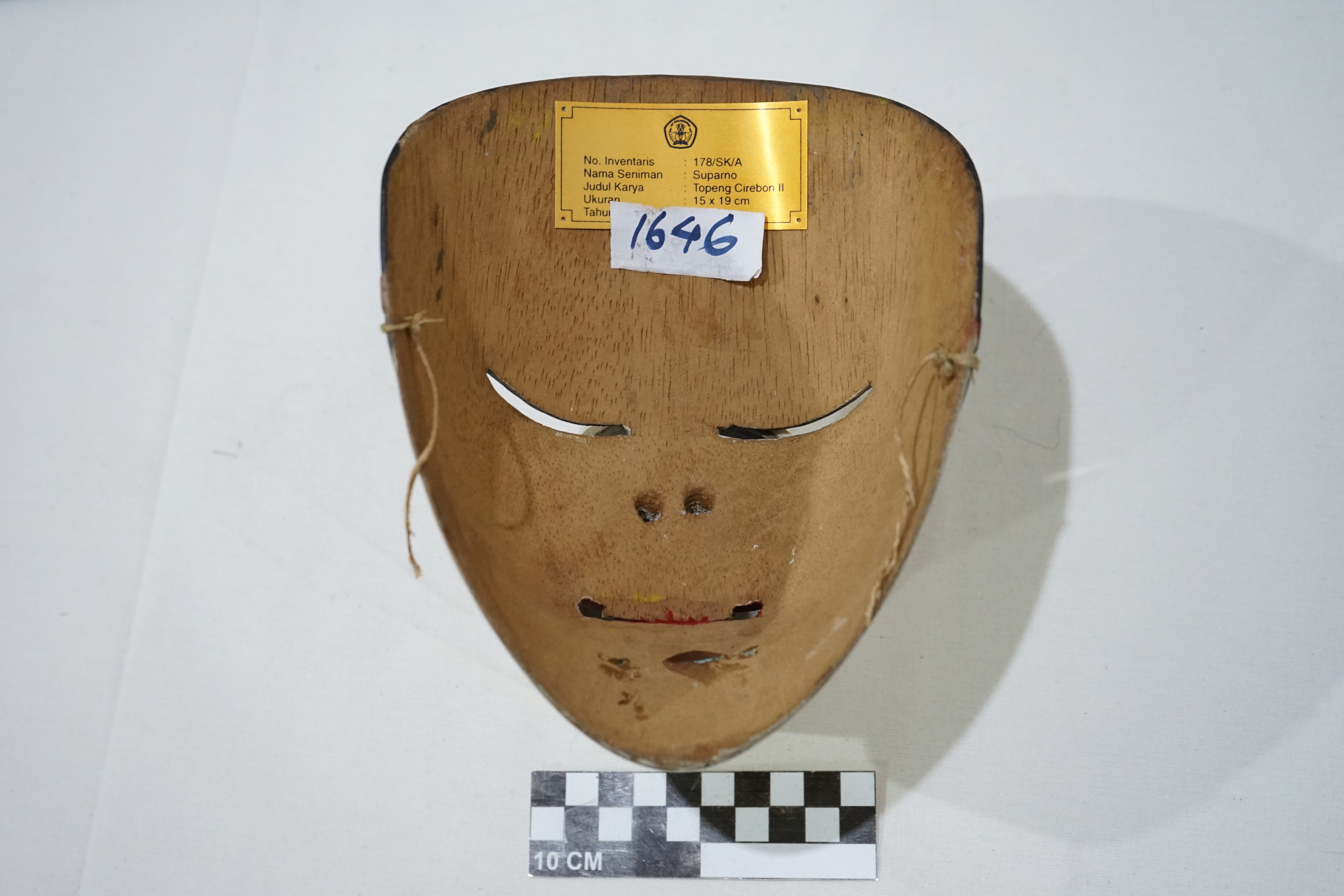 "Suparno Topeng Cirebon II Seni Kriya pada kayu 19 X 15 cm 178/SK/A Deskripsi visual: Topeng Cirebon II merupakan topeng yang terbuat dari kayu. terdapat ornamen berupa mahkota dibagian kepala terdapat warna hitam, keemasan, dan terdapat warna merah. memiliki warna kuning langsat, mata sipit, dibagian bawah bola mata terdapat celah, terdapat dua pola garis bergelombang diatas kedua mata, alis tebal, hidung mancung, terdapat kumis dan muut terbuka hingga gigi tersusun rapi terlihat , bibir bewarna merah.