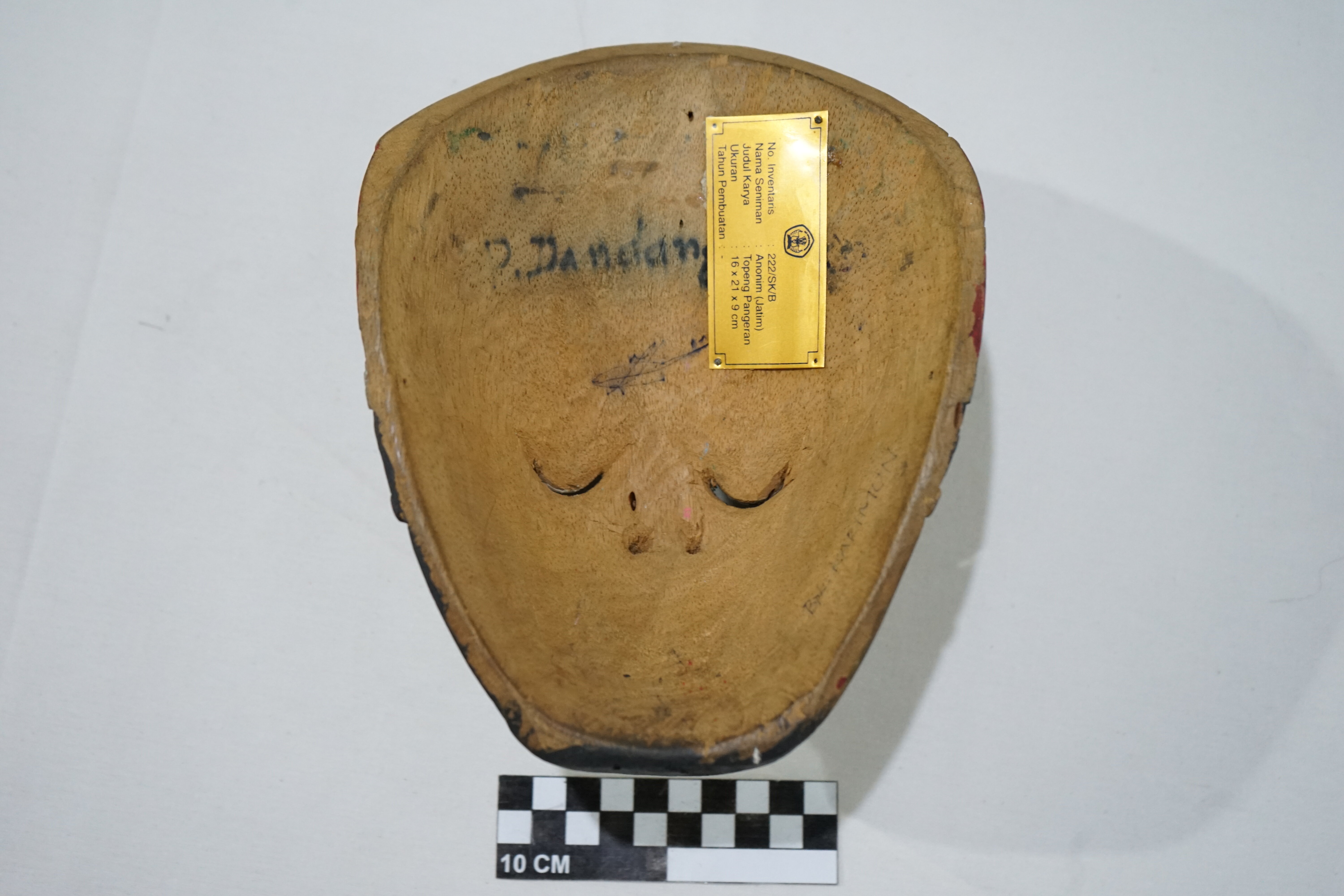"Anonim Topeng Pangeran Seni Kriya pada kayu 21 X 23,5 cm 222/SK/B Deskripsi: Topeng kayu dengan warna putih ini dihiasi mahkota dengan perpaduan warna merah, biru tua, biru muda, putih, hijau tua, hijau muda, merah muda dan emas. Dengan detil ornamen seperti bulu yang diikat dengan ikatan yang berwarna emas. Pada bagian belakang bulu terdapat dua kelopak berbentuk daun dengan warna emas, pada bagian atas mahkota dengan ragam hias floral dengan berbagai warna, sedangkan pada bagian bawah kelopak terdapat hiasan runcing emas dan dibawahnya tedapat ragam hias dengan berbagai paduan warna. Dibawah motif floral terdapat garis bergerigi berwarna emas dan berbentuk daun berwarna hijau. Topeng ini memiliki bulu yang terletak di bawah mahkota, samping kiri dan kanan alis kumis janggut. Pada dahi terdapat hiasan berwarna emas, lengkungan berwarna hitam, dan bagian tengah terdapat alis yang berwarna emas. Pada bagian mata topeng ini terlihat melotot dengan garis hitam melingkar diatasnya. Pada bagian hidung terdapat garis hitam diatasnya. pada bagain janggut berbentuk melengkung yang lancip. Pada bagain dagu terdapat 2 bulatan yang menojol. bibir berwarna merah dan memiliki garis tepi hitam hingga terlihat bagian gigi. Sedangkan, pada bagian samping rambut kiri dan kanan agak mengakar. "