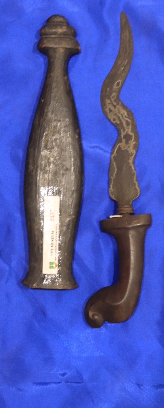 Terbuat dari kayu dicat warna hitam. Bentuk muka bulat panjang/lonjong, kepala botak, telinga besar melengkung, mata melotot keluar, hidung mancung melengkung ke kiri, mulut terbuka sehingga giginya kelihatan, berkumis dan berjenggot dari ijuk. Digunakan untuk tari-tarian dalam upacara adat yang bersifat magis.