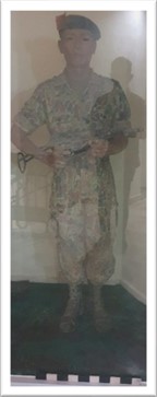 Terbuat dari kayu, muka panjang, mata melotot, hidung mancung berlubang kecil di bagian bawah, gigi besar-besar kelihatan, pipi menonjol, dahi jendol dan kedua telinga lebar diberi lubang kecil di tengahnya. Digunakan untuk tari-tarian suku Dayak Kayan.