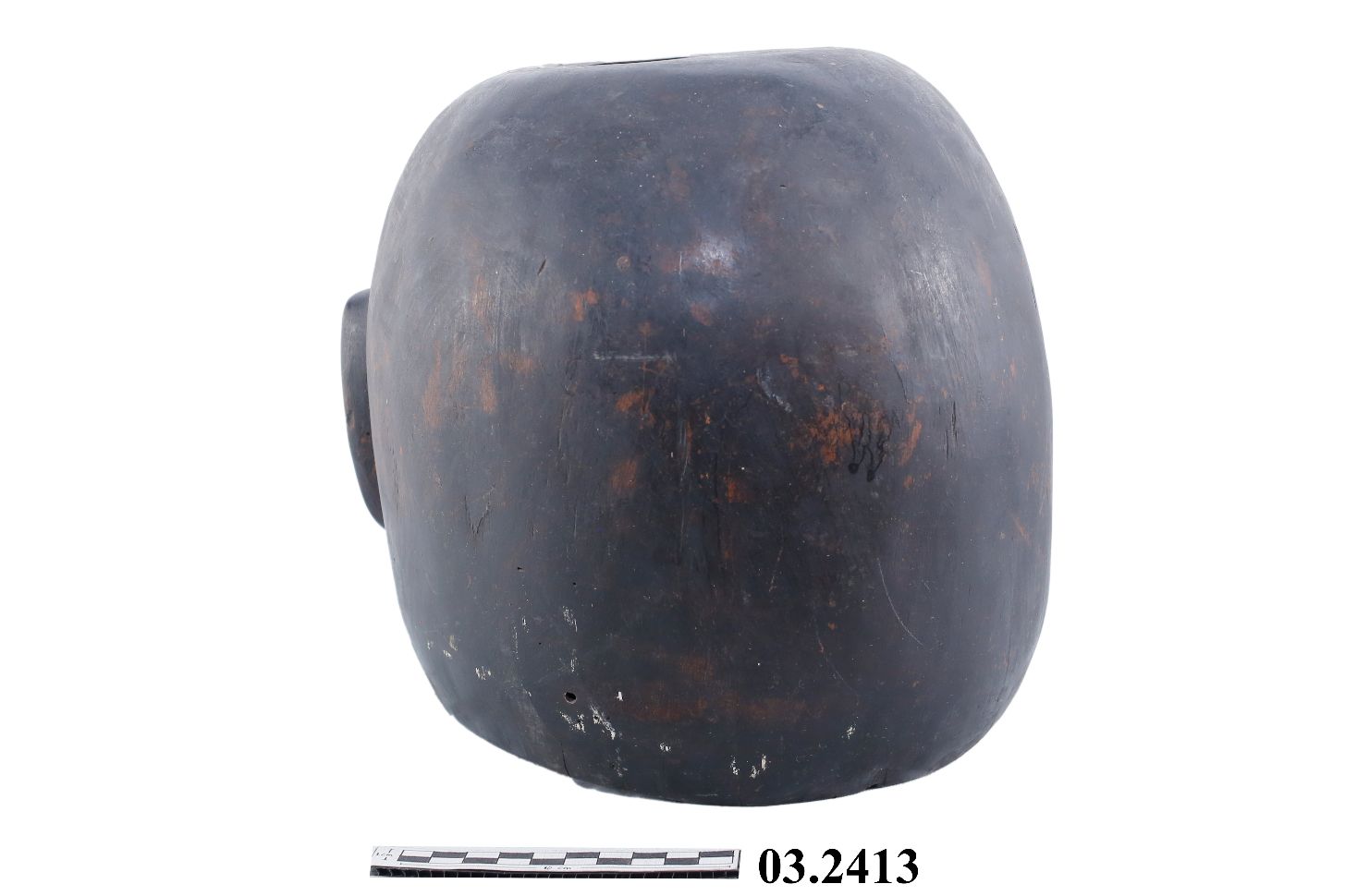 Bulat, pada tengah terdapat pegangan dari logam. Permukaan sedikit cembung.