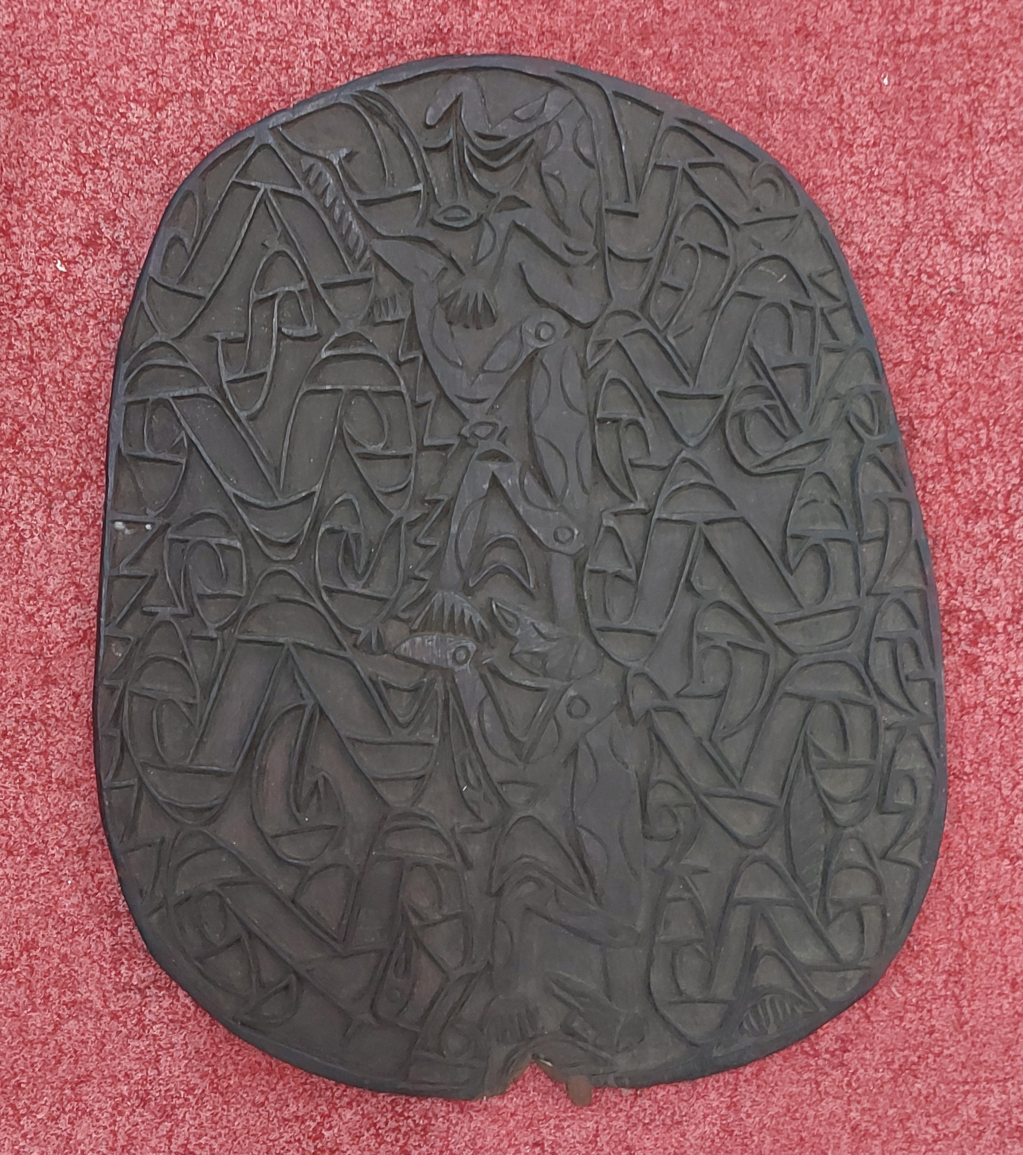 Bulat, pada tengah terdapat pegangan dari logam. Permukaan sedikit cembung.