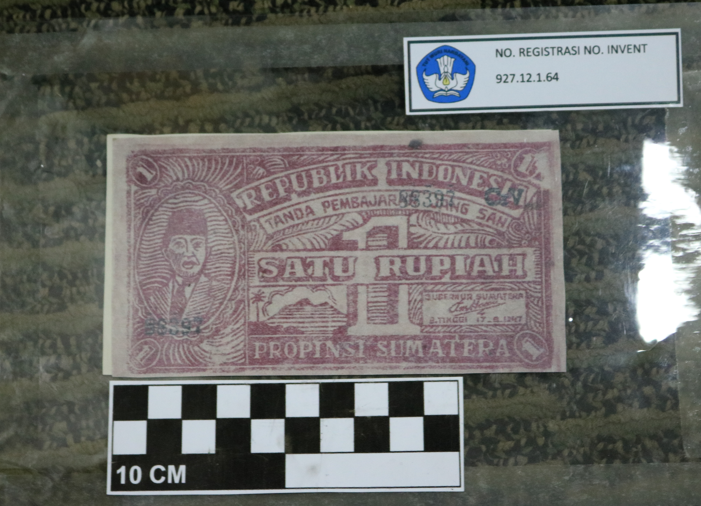 Uang berbahan kertas. Warna dasar uang putih, tetapi telah menguning. Warna dominan uang berwarna merah muda. Sisi depan uang terdapat gambar Ir. Soekarno dan bertuliskan republik Indonesia. Uang bernomor seri 88397 CV yang terletak di sisi depan. Bagian bawah sisi depan uang bertuliskan PROPINSI SUMATERA dengan nominal 1 rupiah. Bagian bawah kanan sisi depan uang terdapat tanda tangan gubernur Sumatera dan tanggal, serta tempat B. Tinggi 17-8-1247. Bagian atas tampak depan memiliki noda hitam. Tampak belakang terdapat beberapa noda hitam dan nominal 1 rupiah, serta tulisan berupa pembayaran yang sah.