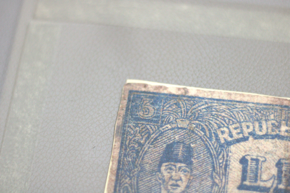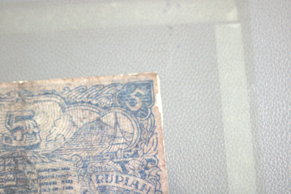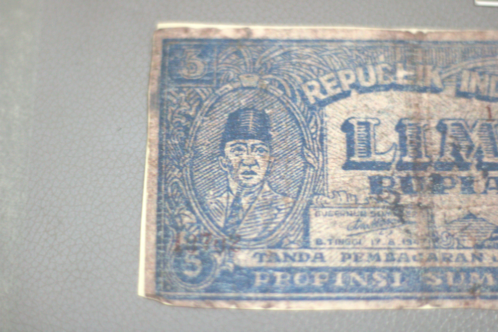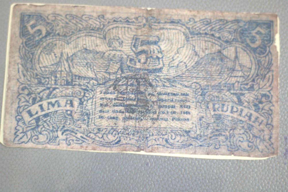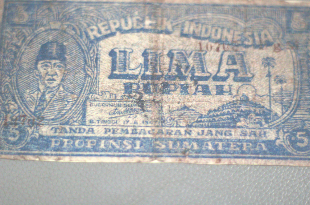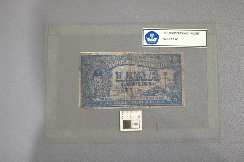 Merupakan Uang Rupiah yang diterbitkan di masa awal kemerdekaan dengan nominal 5 Rupiah. Berwarna dasar putih dengan tinta biru. Tampak Depan: Menampilkan potret Presiden Sukarno di dalam bingkai oval pada sebelah kiri dan pada bagian kanan menampilkan pemandangan Candi. Terdapat tanda tangan Gubernur Sumatera di atas tulisan "B. TINGGI 17 8 1947". Pada bagian tengah uang terdapat tulisan "REPUBLIK INDONESIA LIMA RUPIAH" dan di bagian bawah terdapat tulisan "TANDA PEMBAJARAN JANG SAH PROPONSI SUMATERA. Dapat kita temukan angka "5" pada setiap pojok uang. Terdapat deret angka berwarna merah namun tidak dapat dipastikan tulisannya. Tampak Belakang: Menggambarkan lanskap daerah Sumatera, di mana rumah tradisional saling berjejeran dan pada latar belakang terdapat pegunungan. Di bagian tengah uang terdapat angka "5" yang juga dapat ditemukan pada pojok kanan dan kiri atas koleksi. Pada bagian tengah juga terdapat penjelasan mengenai sahnya uang ini sebagai alat tukar. Kondisi kerusakan: Koleksi dalam kondisi utuh namun terdapat beberapa kerusakan seperti terdapat bagian yang robek dan terdapat pula noda yang mengotori koleksi.