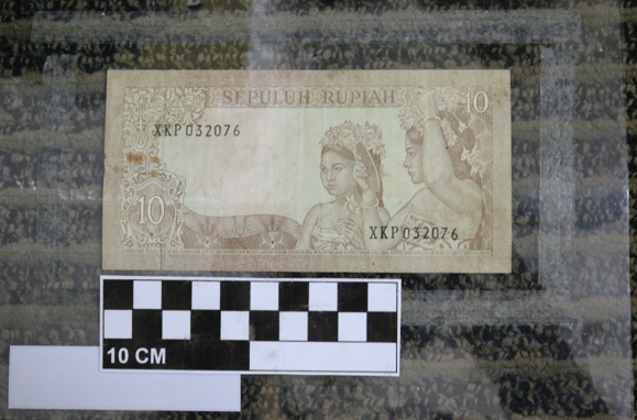 Uang 10 Rupiah diterbitkan oleh Bank Indonesia pada tahun 1960 oleh Pertjetakan Kebajoran, dan ditandatangani oleh PD. Gubernur dan Direktur. Sisi depan uang terdapat gambar Soekarno, lambang Pancasila, dan gambar floral, serta arsiran. Sisi belakang uang bergambar dua wanita mengenakan pakaian tradisional dan hiasan kepala berupa bunga. Salah satu wanita yang mengenakan gelang tampak sedang bercermin. Sisi belakang uang juga terdapat motif flora dan arsir. Ada tulisan peringatan tentang hukum pemalsuan uang. Bagian belakang uang ditemukan nomor seri bertuliskan "XKP 032076". Bila uang diterawang akan ditemukan gambar Soekarno. Terdapat noda cokelat di bagian depan dan belakang, serta kerutan.