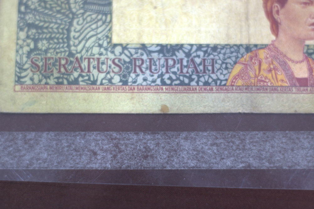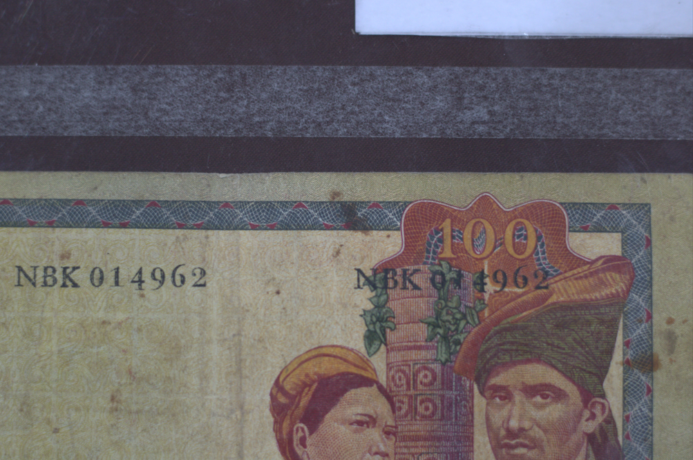 Tampak Depan: Menampilkan potret Presiden Sukarno memakai peci dan pakaian safari. Pada bagian tengah terdapat lambang Garuda Pancasila. Terdapat tulisan "BANK INDONESIA" dan "SERATUS RUPIAH". Selain itu, dapat pula kita temukan tanda tangan dari PD. GUBERNUR dan DIREKTUR. Di bagian kanan tampak depan, terdapat lambang "BI" (BANK INDONESIA). Jika diterawang, terdapat siluet Presiden Sukarno pada koleksi ini. Tampak Belakang: Bagian belakang koleksi menampilkan pria dan wanita yang menggunakan pakaian tradisional. Pada latar belakang dapat kita temukan motif batik dan makhluk mitologi pada pojok kiri atas. Terdapat tulisan "100" pada pojok kanan atas koleksi. Di bagian bawah tampak belakang koleksi, dapat kita temukan peringatan agar tidak meniru/memalsukan uang. Pada pojok kanan atas, dapat ditemukan deret angka dan huruf berikut: NBK 014962. Deskripsi Kerusakan: Koleksi dalam keadaan baik dengan catatan warnanya mulai pudar. Selain itu, terdapat juga beberapa noda yang terlihat pada permukaan koleksi.