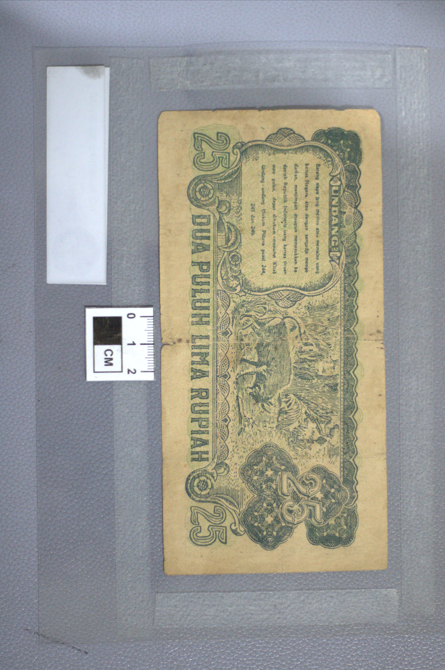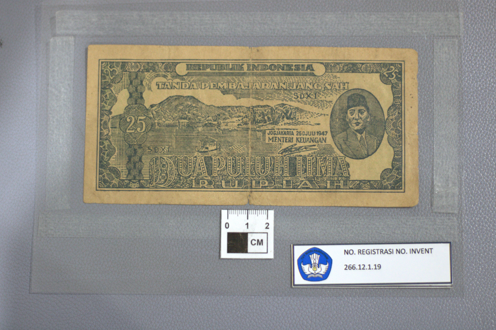 Tampak Depan: Warna dasar putih dengan tinta biru. Tampak depan menggambarkan panorama alam. Di bagian depan terlihat perahu yang berlayar di perairan dan di belakangnya terlihat gunung. Pada bagian kanan, dalam bingkai oval, terlihat potret Presiden Sukarno. Di sebelah kiri potret tersebut terdapat penjelasan "Jogjakarta 26 Djuli 1947" dan "MENTERI KEUANGAN" lalu ada tanda tangan di bawah tulisan tersebut. Pada bagian atas terdapat tulisan "REPUBLIK INDONESIA" dan di bawahnya terdapat tulisan "TANDA PEMBAJARAN JANG SAH" Pada bagian bawah terdapat tulisan "DUA PULUH LIMA RUPIAH". Pada bagian kiri uang, terdapat tanda "25". Tanda tersebut juga dapat ditemukan pada sudut kanan dan kiri atas uang. Tampak Belakang menggambarkan banteng yang sedang berada di tengah hutan. Pada sisi kiri terdapat ancaman untuk peniruan/pemalsuan uang. Terdapat tanda "25" pada sisi kanan uang di depan pola geometris. Terdapat pula tanda yang sama pada pojok kanan dan kiri bawah uang. Kondisi Kerusakan: Warna uang sudah mulai menguning. Terdapat bekas lipatan pada bagian tengah koleksi. Pada bagian lipatan tersebut juga ditemukan bagian yang robek.