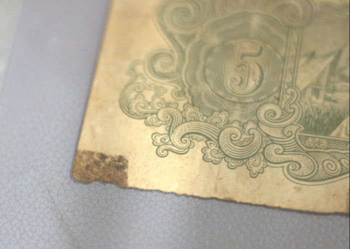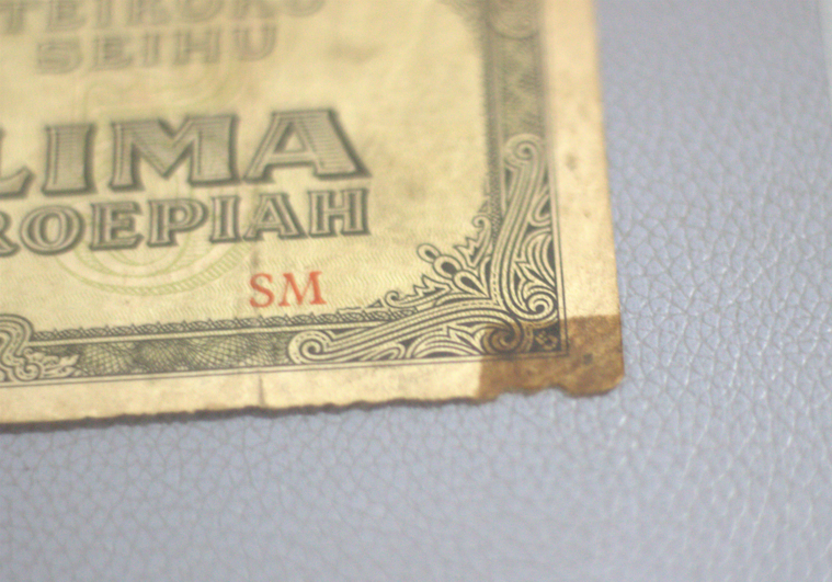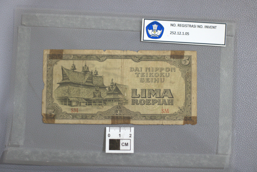 Uang kertas ini memiliki nilai sebesar Lima Rupiah. Pada tampak depan uang kertas terdapat gambar rumah adat yang bertingkat, dan di depannya terdapat tulisan berbahasa jepang yaitu "Dai Nippon Teikoku Seihu" terdapat juga tulisan "Lima Roepiah" pada sudut kanan atas dan sudut kiri bawah terdapat angka lima menunjukan nilai dari uang ini. Terdapat pola ukiran-ukiran pada setiap sisi uang kertas yang menyambung dengan memiliki beberapa bentuk ukiran yang berbeda-beda seperti jaring dan ukiran seperti daun. Pada tampak depan bagian bawah juga terdapat aksara Jepang dan di atasnya terdapat ukiran dan angka lima. Pada bagian tulisan Lima Roepiah terdapat juga angka Lima pada bagian belakangnya dan kedua sisi kanan kiri memiliki tulisan "SM" berwarna merah. Pada bagian belakang uang kertas didominasi warna hijau dan bagian depan berwarna hitam. Pada bagian belakang uang kertas terdapat juga gambar perempuan dengan menggunakan pakaian adat dengan penutup kepala dengan latar belakang gambar pemandangan dengan atap rumah dan pohon kelapa serta gambar rumput. Pada bagian belakang juga memiliki dua angka lima dengan memiliki ukiran dan sekitarannya memiliki ukiran dan dikelilingi garis melingkar. Pada bagian tengah uang kertas memiliki pola ukiran yang unik dan bermacam-macam dengan beberapa ukiran berbentuk seperti gelombang yang secara menyatu dan ukiran seperti jaring, yang menjadikan unik adalah ukiran-ukiran ini hanya berapa di tengah bagian uang ini saja. Kondisi uang kertas ini sudah memiliki kerusakan seperti terdapat beberapa bagian bekas solasi dan terdapat juga beberapa sobekan pada tepi uang dan pada bagian belakang terdapat bagian yang terkikis. Warna uang ini juga sudah mengusam.