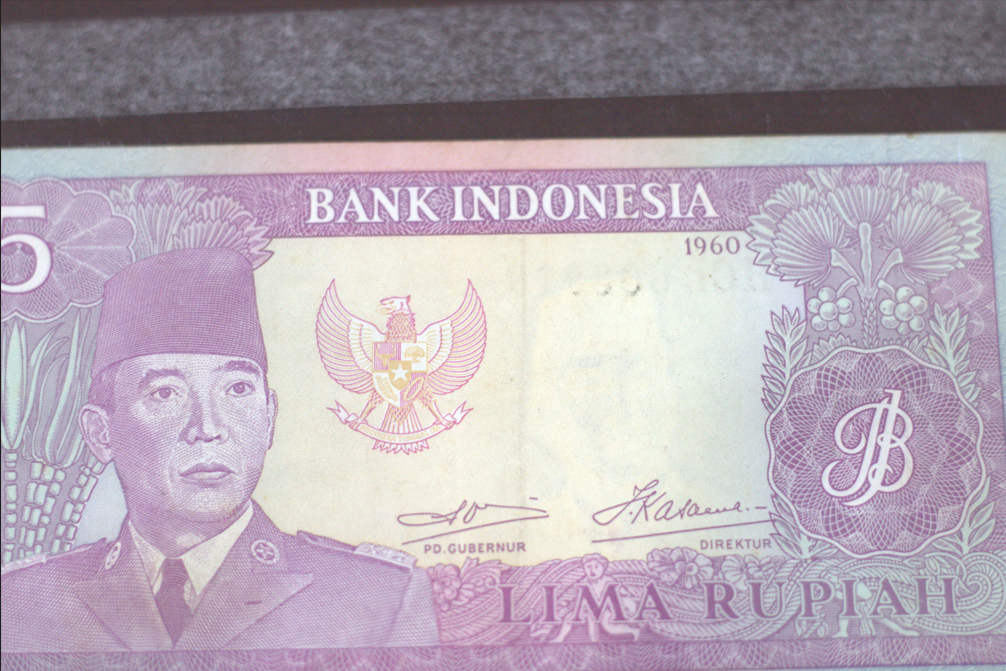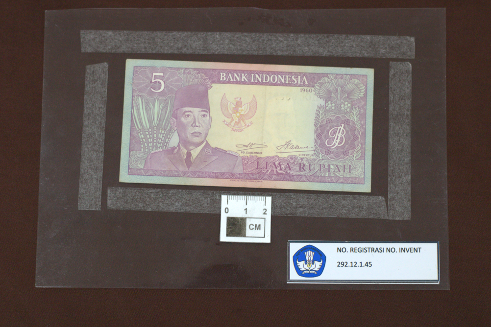 Uang berbahan kertas yang bernilai lima rupiah dan berwarna merah. Pada uang kertas bagian depan kiri terdapat gambar tokoh Ir. Soekarno dan di bagian atas terdapat tulisan "Republik Indonesia". Pada bagian kanan terdapat logo dari Bank Indonesia. Pada sisi atas bagian kiri terdapat angka bertuliskan "5". Pada bagian kiri terdapat gambar seperti pohon tebu/bambu, bunga serta pola floral di sisi kiri dan kanan uang. Pada bagian atas terdapat tulisan "Bank Indonesia". Pada bagian kiri juga terdapat lambang negara Indonesia yaitu Garuda Pancasila. Pada bagian kanan atas terdapat tahun 1960. Dan pada bagian bawah terdapat tanda tangan dari P.D Gubernur dan Direktur. Di sisi kanan paling bawah terdapat tulisan "LIMA RUPIAH". Dan di bagian paling bawah terdapat tulisan "PERTEJATAKAN KEBAJORAN". Pada bagian belakang terdapat berbagai macam pola. Pada sudut atas kiri terdapat angka bertuliskan "5" dan pada bagian atas dan kiri terdapat tulisan "LIMA RUPIAH" dan di bagian kanan terdapat gambar seorang wanita yang memakai pakaian adat Bali. Pada bagian bawah terdapat tulisan "BARANGSIAPA MENIRU ATAU MEMALSUKAN UANG KERTAS DAN BARANGSIAPA MENGELUARKAN DENGAN SENGADJA ATAU MENJIMPAN UANG KERTAS TIRUAN ATAU UANG KERTAS JANG DIPALSUKAN AKAN DITUNTUT DIMUKA HAKIM”. Kondisi: Uang kertas ini memiliki kondisi yang baik, tidak ada kerusakan maupun warna uang kertas yang memudar. Hanya saja terdapat bercak noda di bagian depan uang kertas.