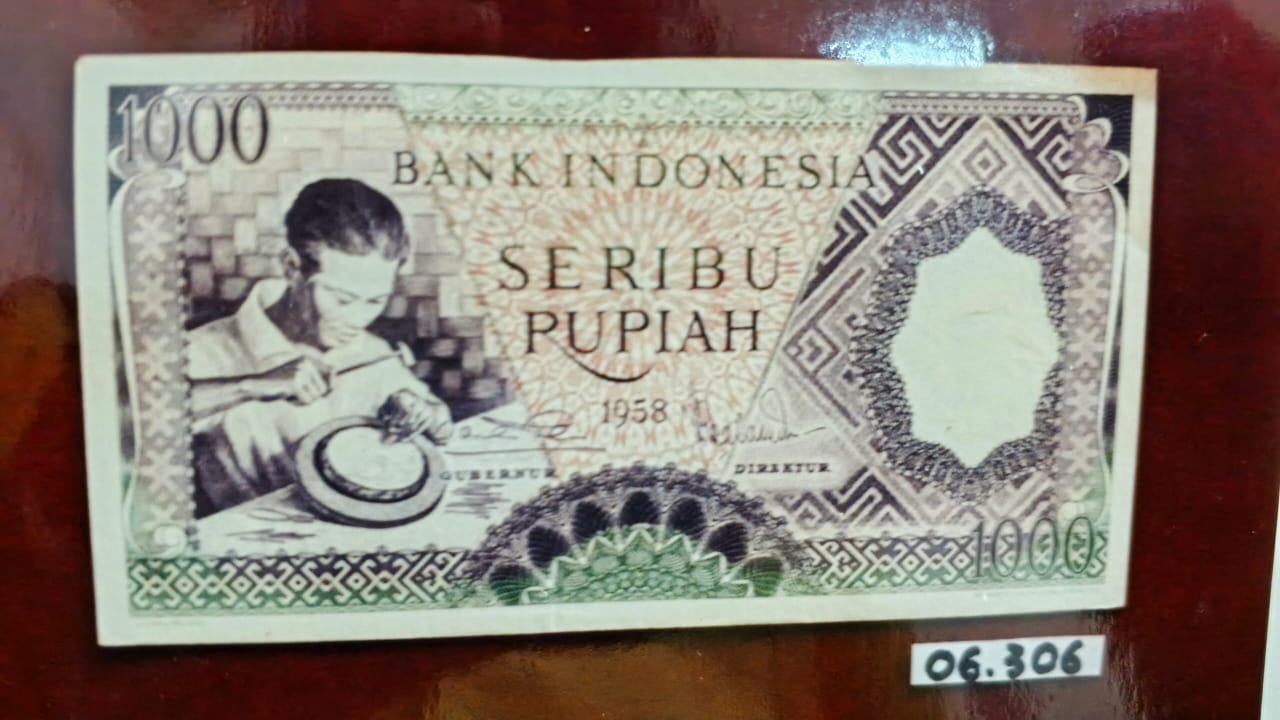 Terbuat dari bahan kertas, bentuk empat persegi panjang, nilai nominal 100 rupiah, dominasi warna coklat kehitaman merah dan kuning. Merupakan seri bunga dan burung. Sisi muka sebelah kiri terdapat hiasan motif spiral,roset, suluran, ada tulisan Djakarta 1 Djanuari 1959 merupakan tanda mencetak tahun emisi. Bagian tengah terdapat tulisan serta tanda tangan Gubernur serta Direktur, ada hiasan motif bunga raflesia , pilin, tumpal dan geometris. Sebelah kanan angka 100 dalam kotak, angka 100 lebih kecil. Lambang burung Garuda dapat dilihat bila diterawang ke arah cahaya. Bagian bawah terdapat nama pencetak Thomas De La Rue & Company, Limited. Sisi belakang terdapat angka 100 di sebelah kanan dan kiri lebih besar dan gambar lima ekor burung enggang dengan latar belakang pepohonan. Tertulis nomor seri 100 NBV 24031 . Digunakan sebagai alat pembayaran pada masa pemerintahan orde lama. Literatur ; Bank and Coins From Indonesia 1945-1990