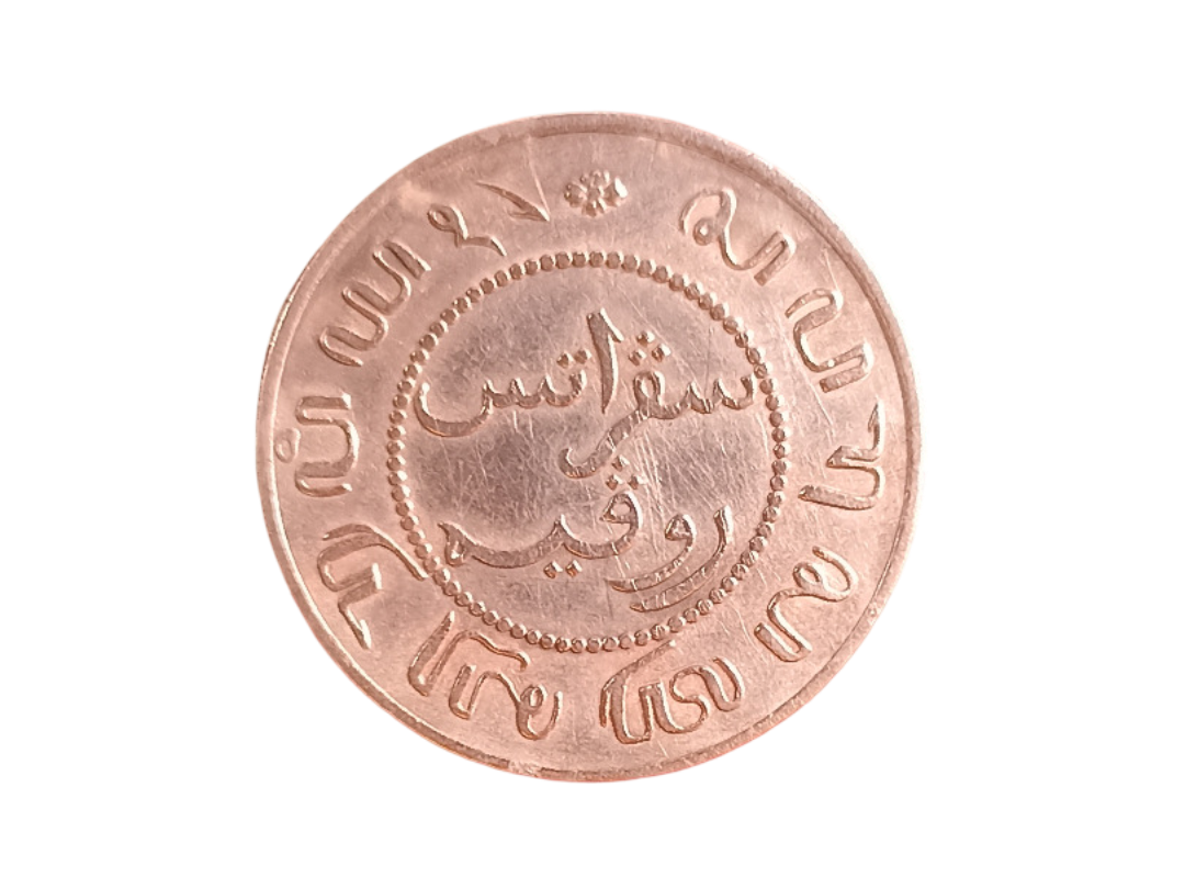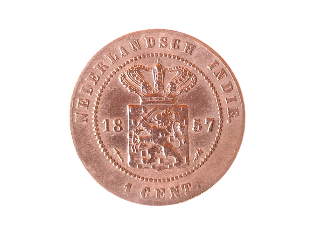 Terbuat dari tembaga dengan bentuk bundar pipih. Pada bagian sisi depan terdapat lambang Kerajaan Belanda (singa dalam mahkota), tulisan NEDERLANDSCH INDIE, angka tahun 1857 dan nilai nominal uang 1 Cent. Bagian sisi belakang terdapat Aksara Jawa yang berbunyi "Sapara Satus Rupiyah" dan aksara Arab berbahasa Melayu yang berbunyi "Seperatus Rupiah".