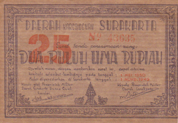 Terbuat dari tembaga dan berbentuk bundar pipih dengan bagian sisi depan terdapat lambang Kerajaan Belanda (singa dalam mahkota), tulisan NEDERLANDSCH INDIE, angka tahun 1860 dan nilai nominal uang 1 Cent. Bagian sisi belakang terdapat Aksara Jawa yang berbunyi "Sapara Satus Rupiyah" dan aksara Arab berbahasa Melayu yang berbunyi "Seperatus Rupiah"