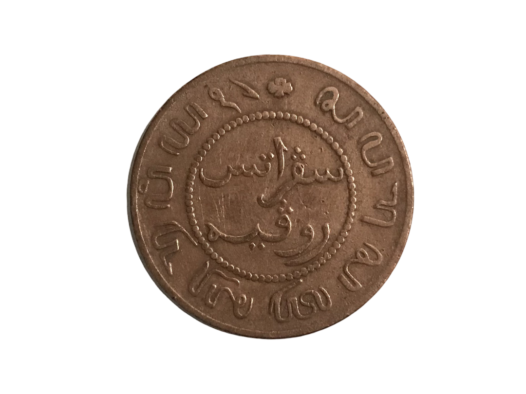 Berbentuk bulat pipih dengan bagian sisi depan terdapat lambang Kerajaan Belanda (singa dalam mahkota), tulisan NEDERLANDSCH INDIE, angka tahun 1858 dan nilai nominal uang 1 Cent. Bagian sisi belakang terdapat Aksara Jawa yang berbunyi "Sapara Satus Rupiyah" dan aksara Arab berbahasa Melayu yang berbunyi "Seperseratus Rupiah".