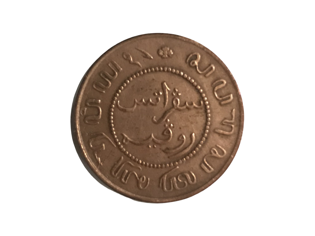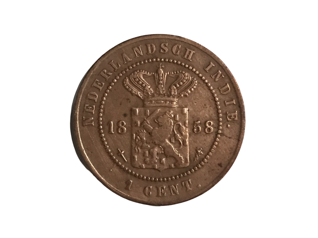 Berbentuk bulat pipih dengan bagian sisi depan terdapat lambang Kerajaan Belanda (singa dalam mahkota), tulisan NEDERLANDSCH INDIE, angka tahun 1858 dan nilai nominal uang 1 Cent. Bagian sisi belakang terdapat Aksara Jawa yang berbunyi "Sapara Satus Rupiyah" dan aksara Arab berbahasa Melayu yang berbunyi "Seperatus Rupiah"