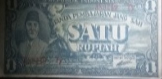 Uang Satu rupiah dengan warna dasar putih dan biru, gambar Presiden RI -I (Soekarno) tahun 1964