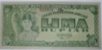 Uang Lima rupiah dengan warna dasar putih dan hijau, gambar Presiden RI -I (Soekarno) tahun 1947