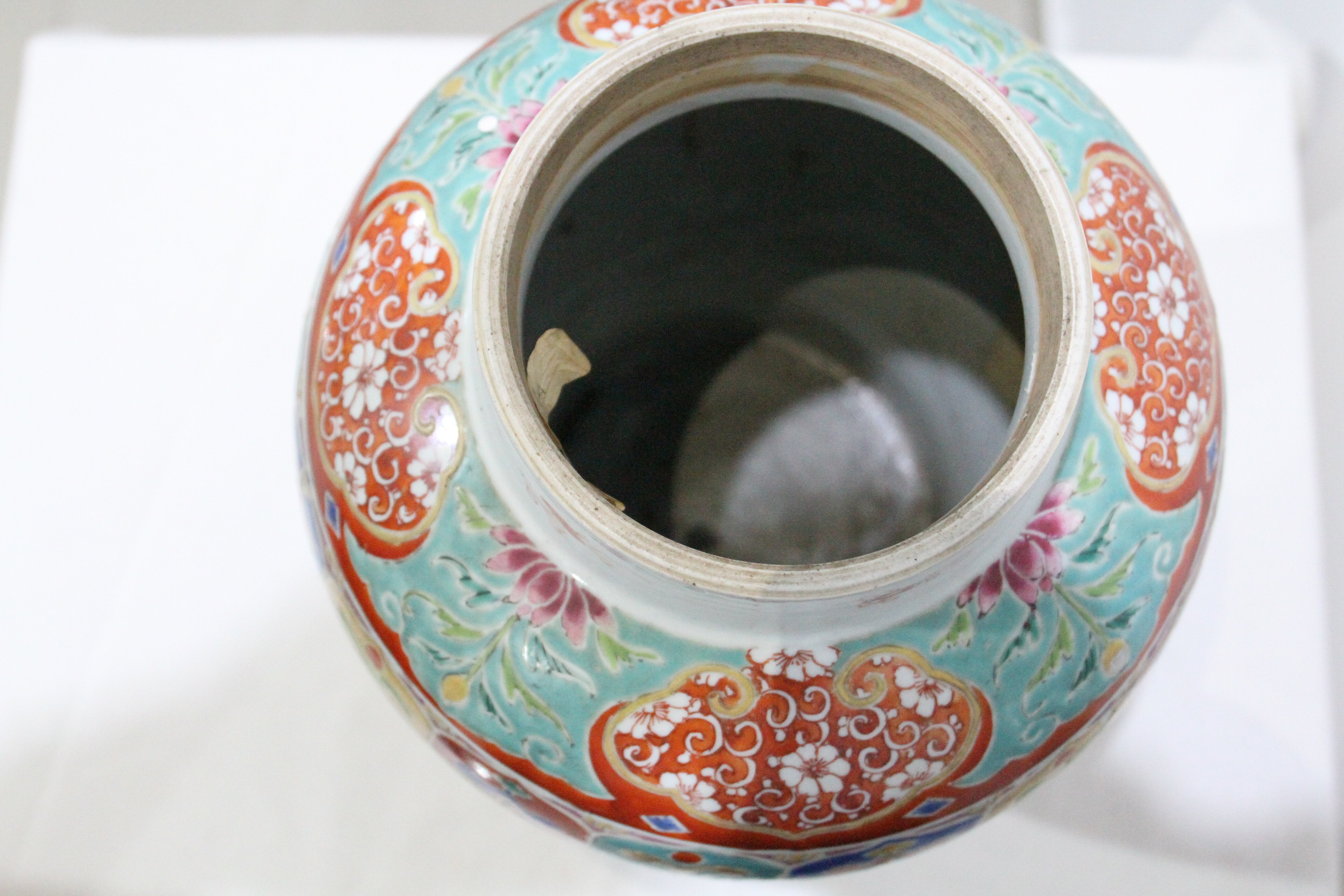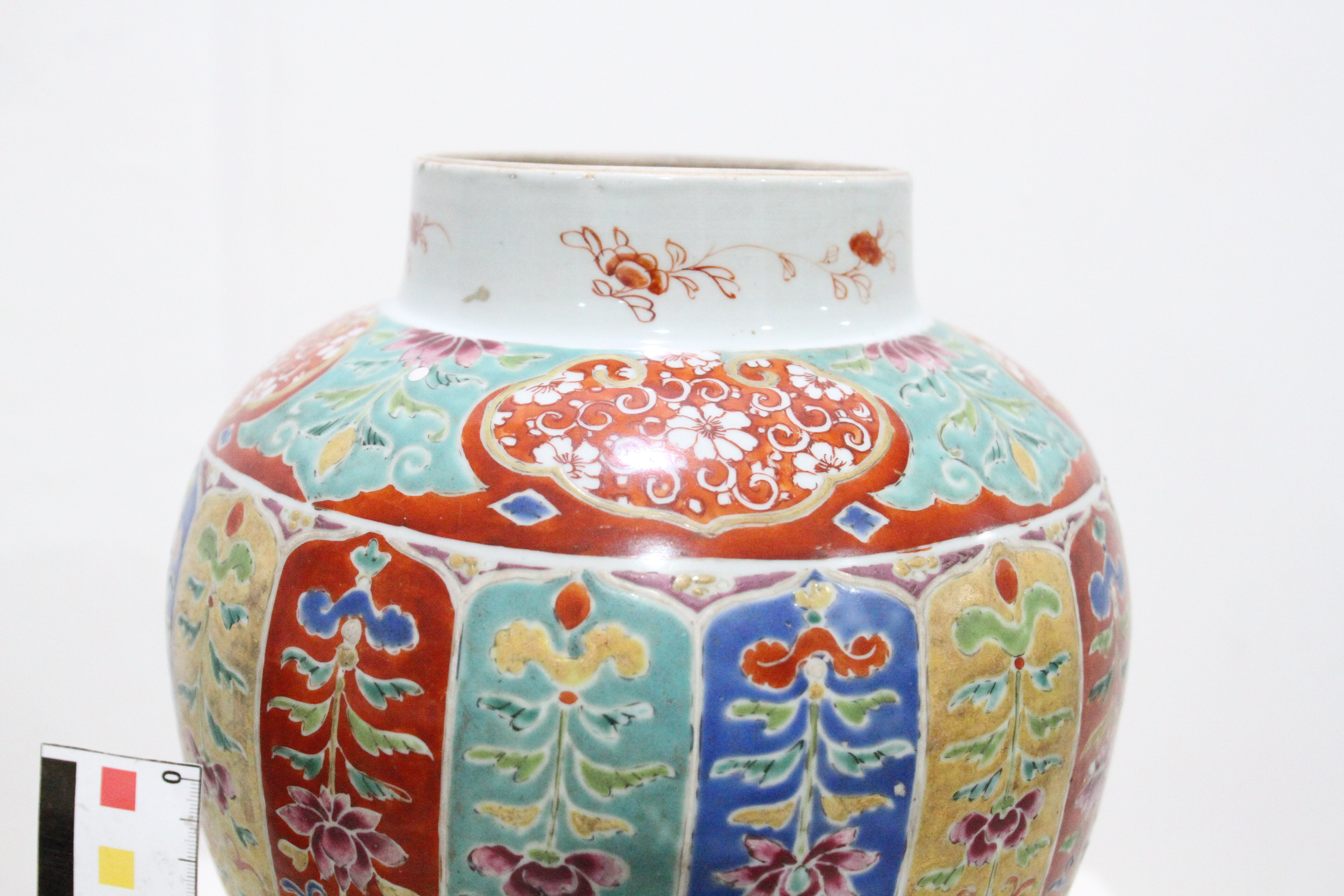 Dari Dinasti Ching Vas Seni Kriya 155/SK/A Vas ini terbuat dari porselen dengan warna dasar putih dengan motif yang beraneka warna. Pada bagian leher vas terdapat motif floral yaitu bunga dengan tangkai dan daunnya mengelilingi leher vas berjumlah 6 buah. Lalu pada bagian Pundak terdapat motif kelopak bunga Teratai berjumlah 4 yang mengelilingi Pundak yang berwarna ungu dengan batang dan daun berwarna hijau. Lalu terdapat juga motif floral berwarna dasar merah dengan bunga dan sulur berwarna putih. Perbagian di kelilingi dengan garis berwarna emas. Pada bagian Pundak berwarna dasar hijau tosca. Terdapat 8 motif belah ketupat berwarna biru dengan border putih. Terdapat garis berwarna putih yang mengelilingi dan sebagai pembatas antara Pundak dengan badan. Dibawah garis pembatas terdapat motif kelopak bunga berwarna emas yang mengelilingi badan atas vas, pada bagian bawah terdapat motif floral dengan warna dengan warna dasar selang-seling yaitu kuning, merah, hijau tosca dan biru. Pada tiap grup motif terdapat border garis putih untuk membedakan setiap warna. Pada bagian kaki berwarna dasar hijau dengan motif berwarna merah. Terdapat garis kuning yang berada diantara kelompok garis warna hijau dan merah. Pada bagian dasar kaki terdapat garis berwarna putih yang mengelilingi.
