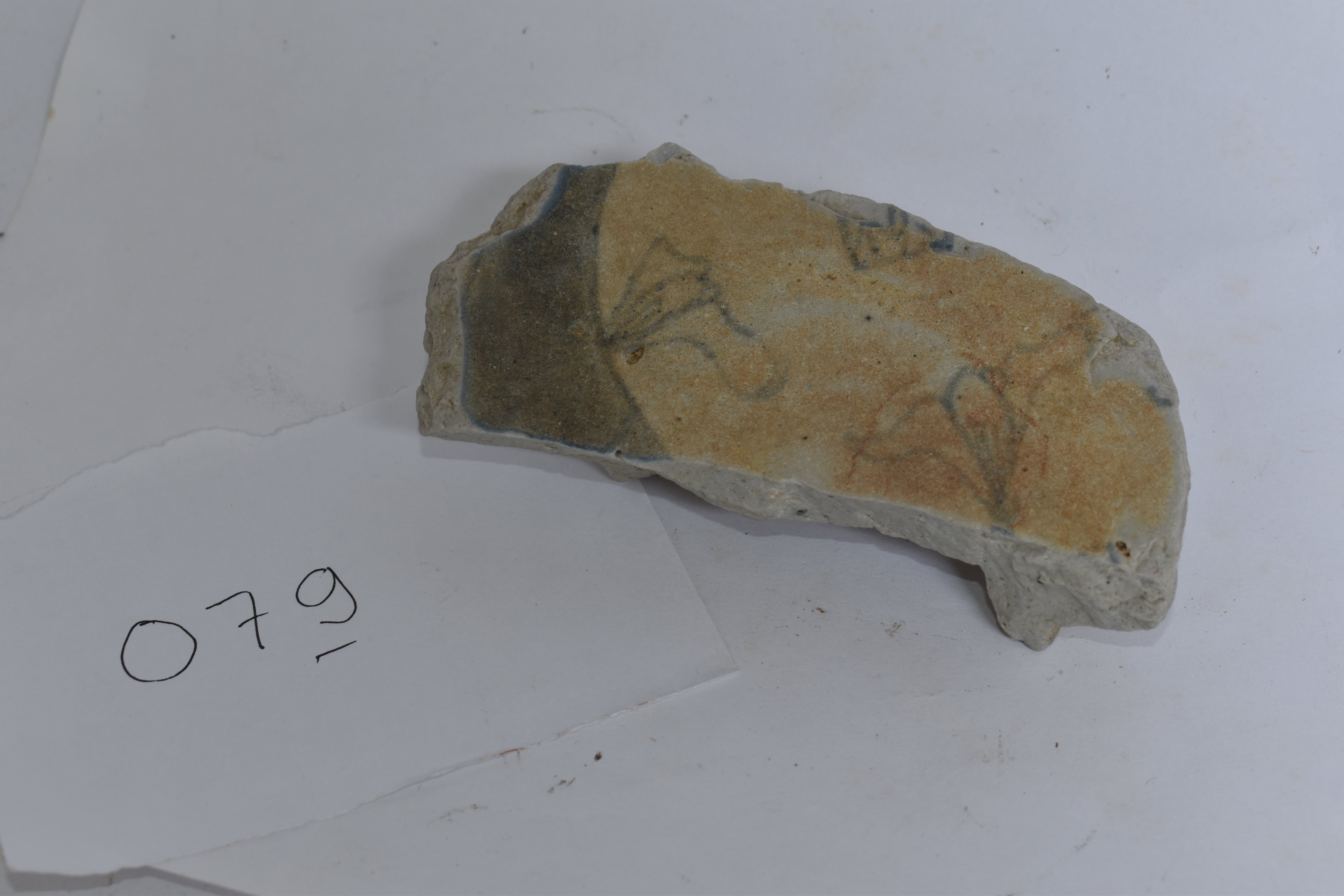 Fragmen keramik porselen biru putih China yang diperoleh dari hasil ekskavasi arkeologi di Pulau Onrust, Kabupaten Kepulauan Seribu, Jakarta ini berbentuk wadah berupa mangkuk yang dibuat menggunakan teknik roda putar. Fragmen keramik berukuran 11 cm, terbuat dari tanah liat putih (kaolin) dan mineral feldspar (petunze) yang dibakar pada suhu sangat tinggi sekitar 1.250°C – 1.350°C. Permukaannya dihiasi motif flora warna biru pudar yang dilukis di bawah glasir putih transparan. Namun keramik ini telah terkontaminasi sehingga permukaannya berwarna kuning. Keramik ini termasuk dalam kategori porselen biru putih (blue and white porcelain). Berdasarkan karakteristiknya, keramik ini dibuat di dapur China pada masa Dinasti Qing abad ke-19 Masehi.