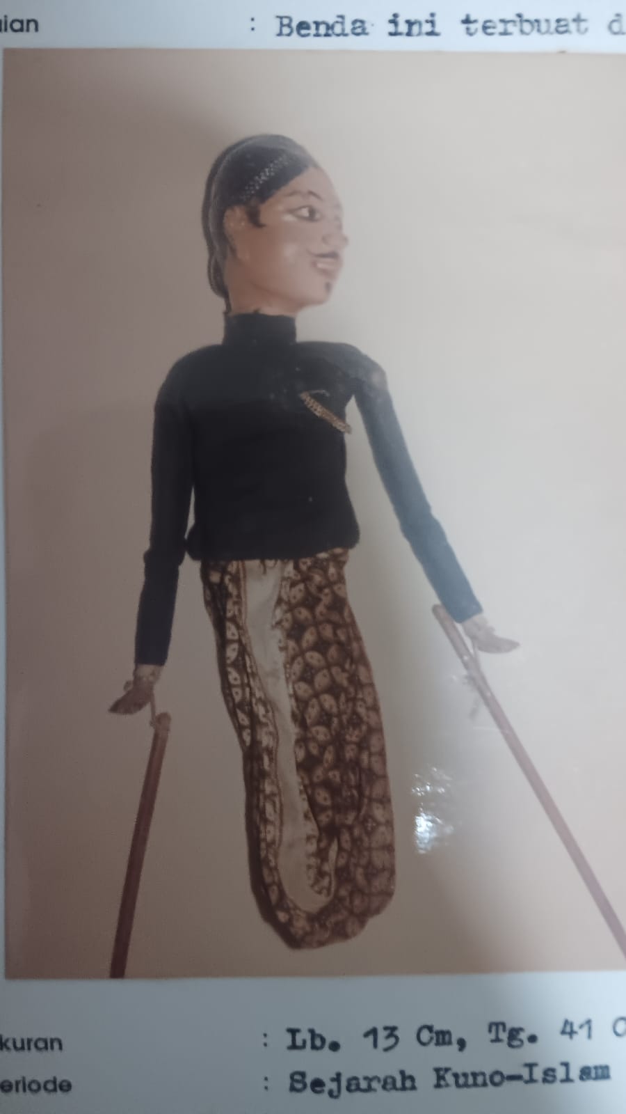 Benda ini terbuat dari bahan dasar kayu, bambu, kain.Wayang ini memakai blangkon hitam, dengan mondolan, sorjan hitam, kain-bermotif kawung yang panjangnya dua kali dari ukuran umumnya, penampilan layaknya bangsawan. Berjenis kelamin, pria.