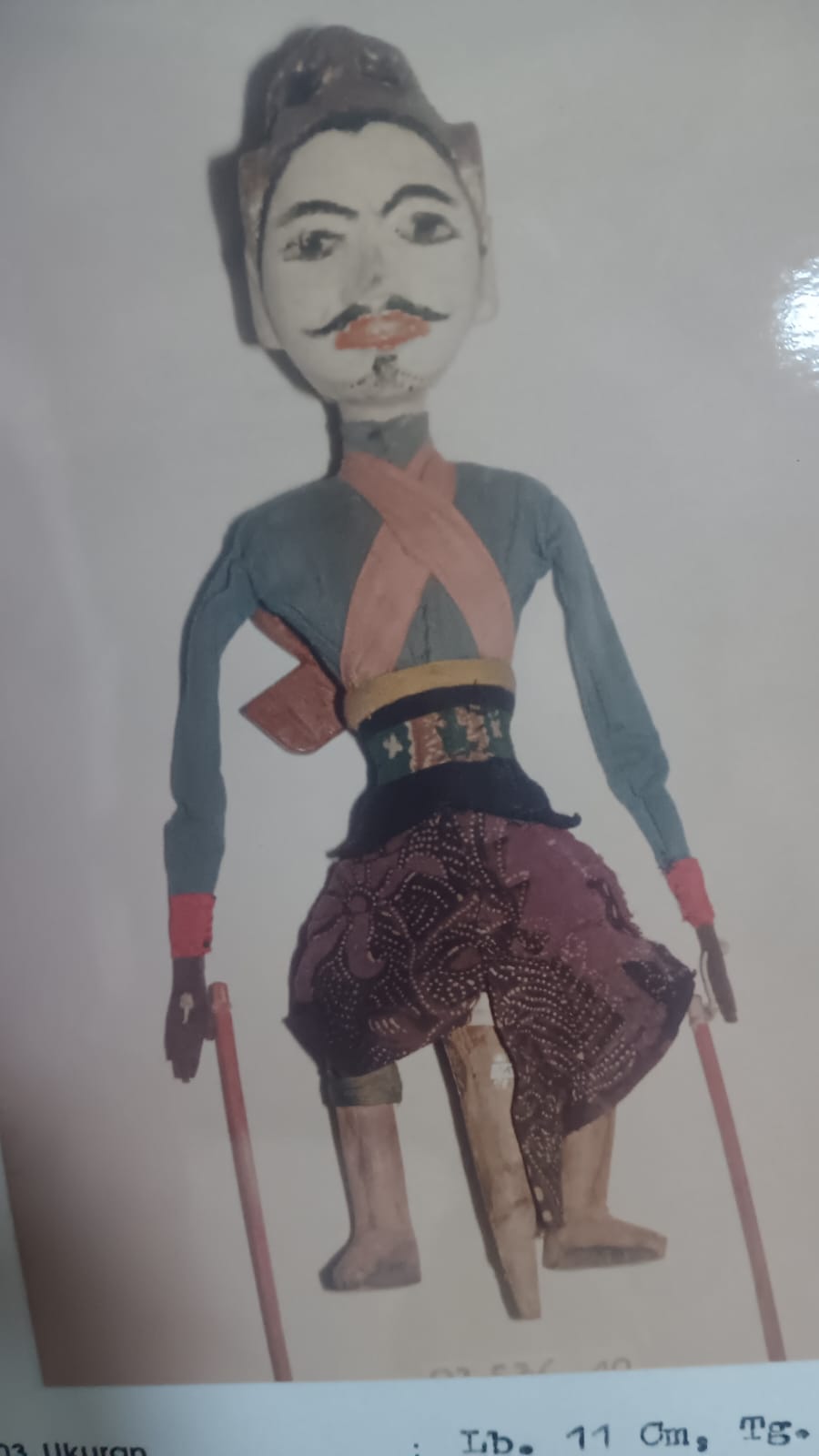 Wayang ini terbuat dari bahan dasar kayu, tangan terbuat,-dari kulit. Wayang ini memakai mankota, wajah cerah, setelan sorjan warna biru. Berselempang, memakai kain warna ungu, dengan keris dipunggungnya. Jenis kela-min pria.