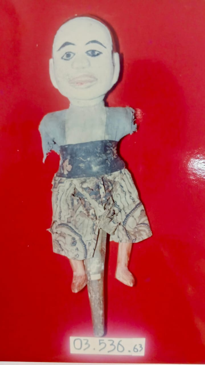 Wayang ini terbuat dari banan dasar kayu, kepala tanpa, rambut, wajah putih, bibir domble, pakaian atas biru, kain motif parang-garuda. Jenis kelamin pria.