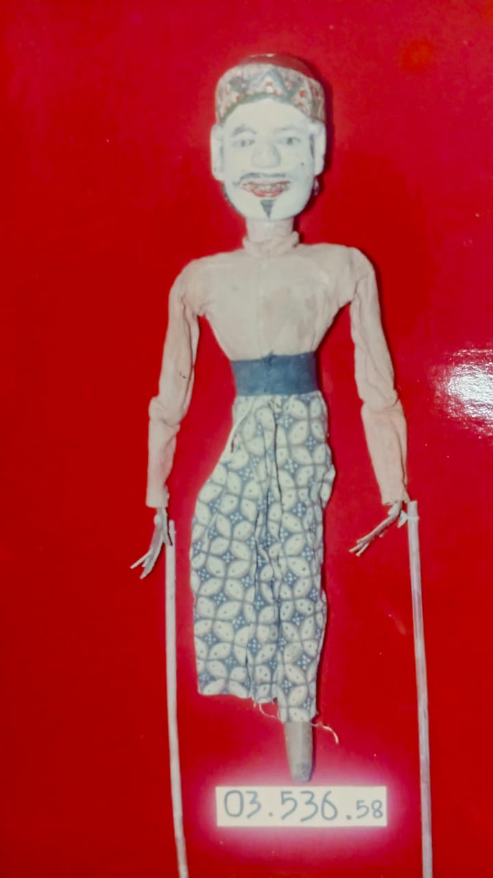 Wayang golek ini terbuat dari bahan dasar kayu, tangan terbuat dari kulit, wayang memakai kuluk dengan sanggul dan sumping, wajah keperempuanan, bibir bergincu, Sorjan warna merah dengan kain pan-jang motif kawung.