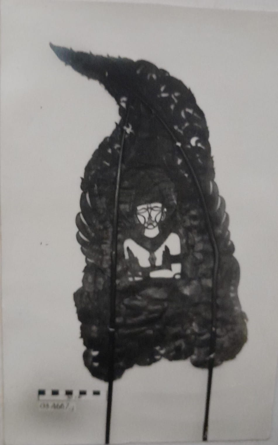 Benda ini terbuat dari bahan dasar kayu dan bambu, ber-Jenis kelamin pria menggunakan kuluk, berkumis dan berjambang, mata melotot, gigi bertaring panjang, bagian hidung-patah.