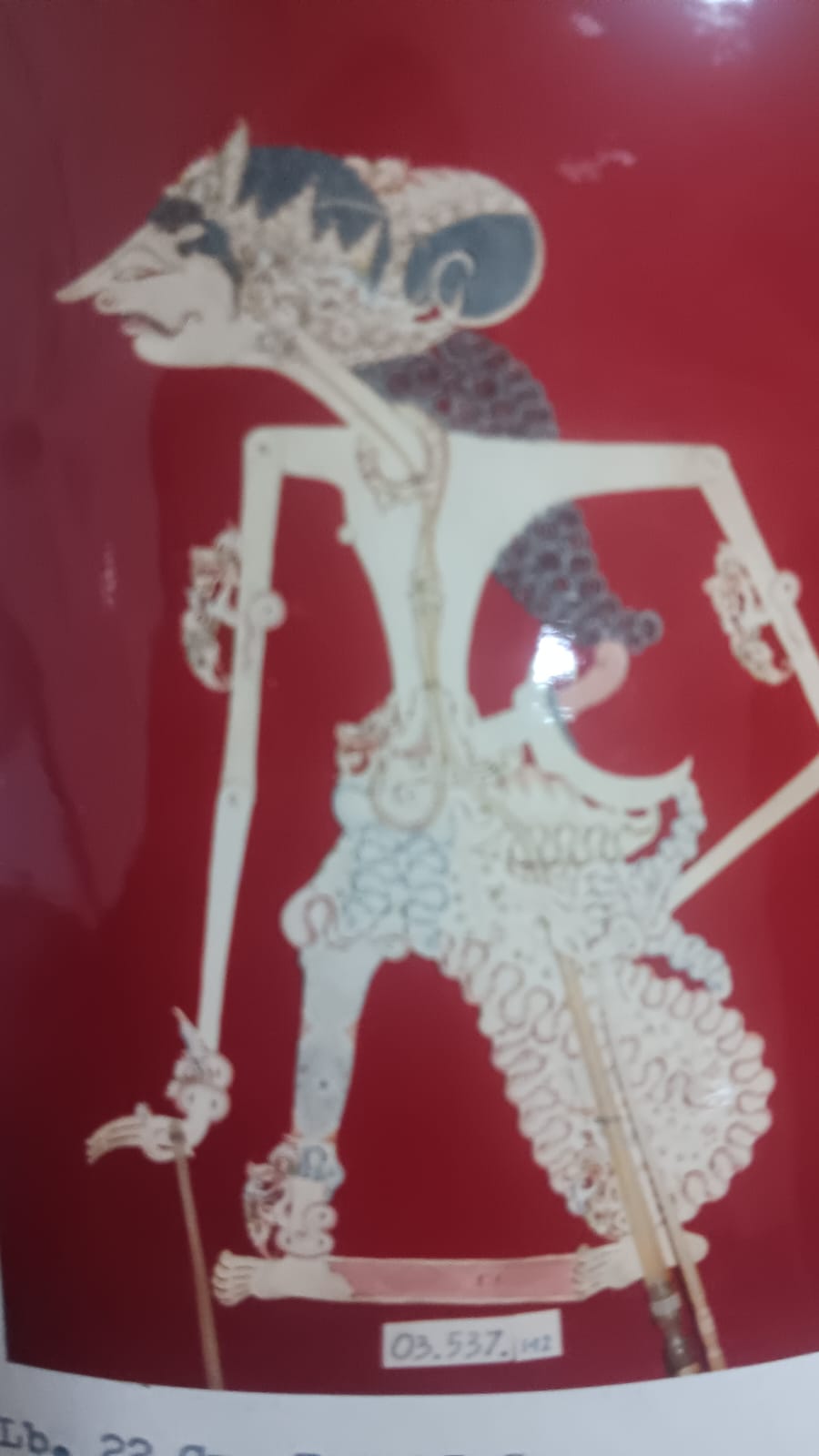 Benda ini terbuat dari bahan dasar kulit, berwarna coklat-merah, putih,hijau,-biru, kuning, Rambut,-panjang, hidung man-cung, celana panjang. Bersenjata keris.