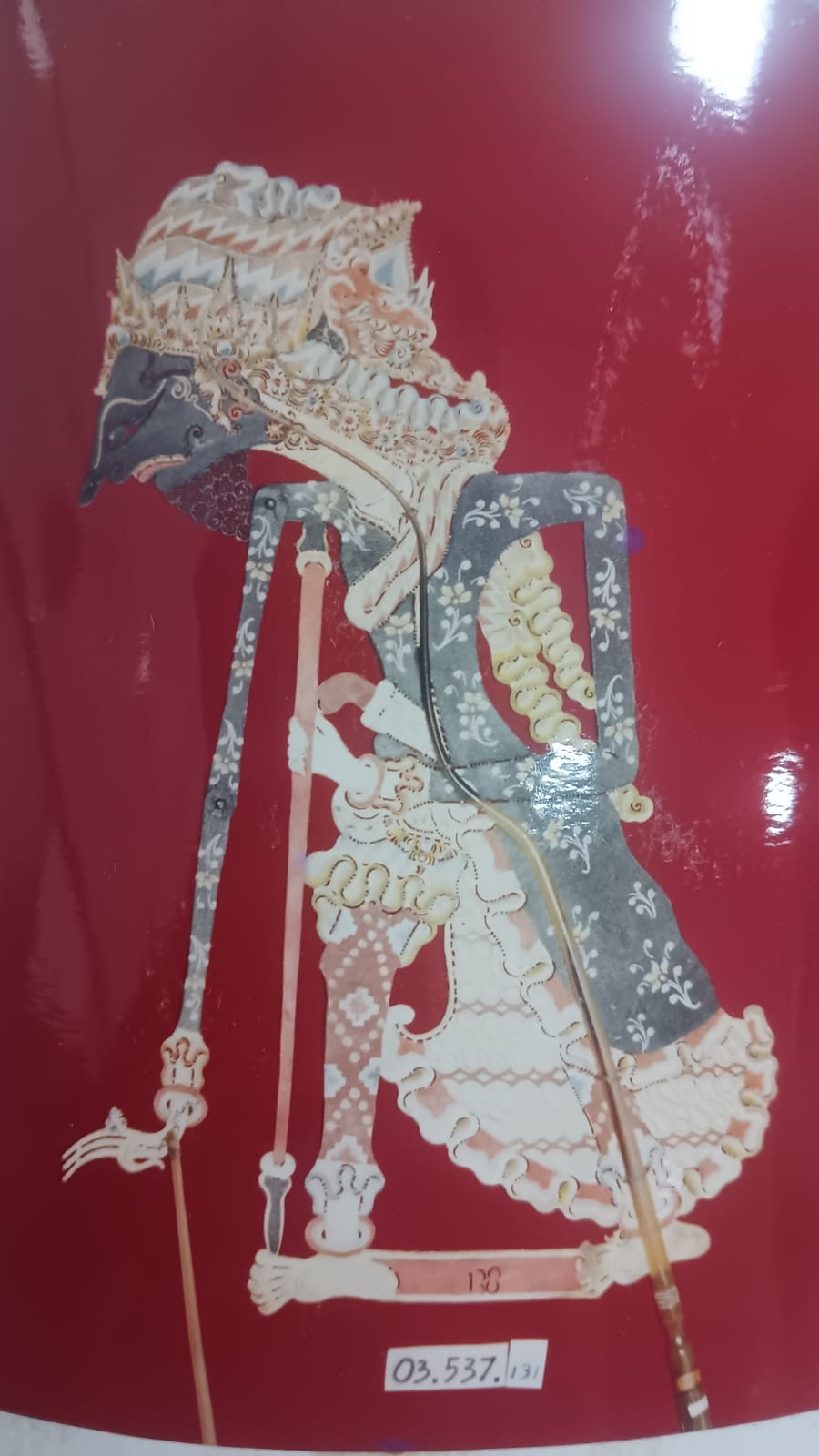 Benda ini terbuat dari bahan dasar kulit , berwarna coklat, merah,hijau,, hitam, putih, Rambut digelung memakai surban. Hidung mancung, wajah hitam,baju jubah, celana panjang, jariklereng,senjata badik di depan