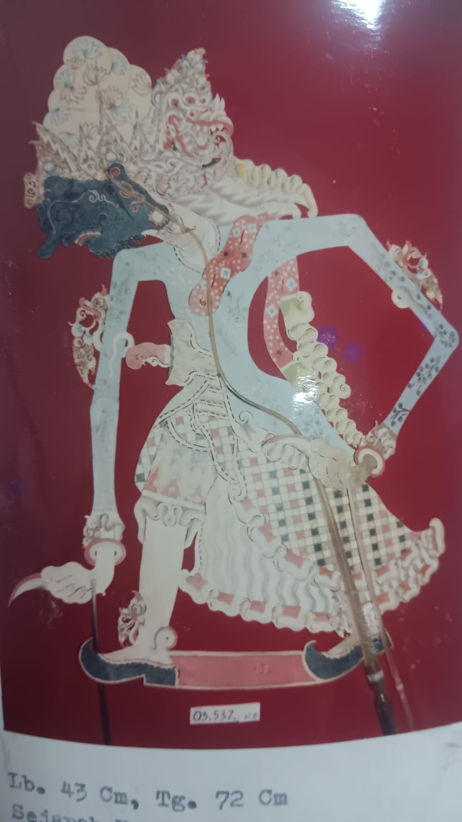 Benda ini terbuat dari bahan dasar kulit, berwarna merah, biru, putih, hitam. Rambut digelung,-memakai serban, hidung besar, muka hitam, -baju sembagai, jarik-kotak-kotak, celana-pendek, bersenjata -keris di depan.