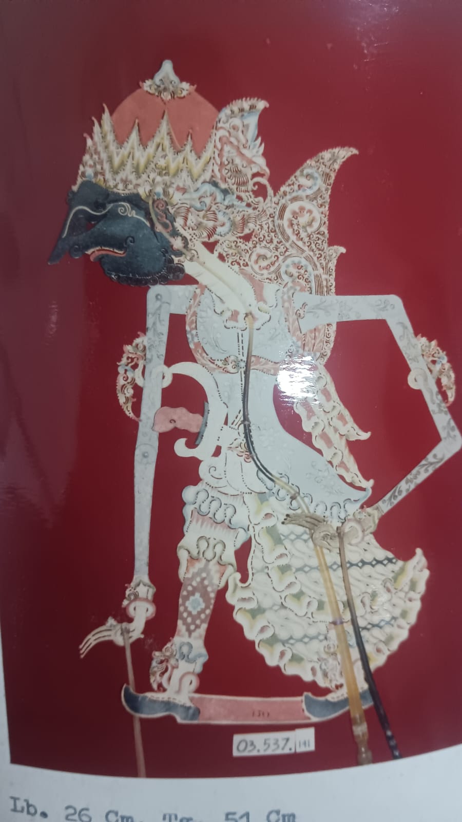 Benda ini terbuat dari bahan dasar kulit, berwarna coklat, merah, ungu, hijau,-hitam kuning. Rambut-gelung, hidung man-cung, memakai kuluk-wajah hitam.Celana-panjang, jarik lereng baju sembagi. Ber-senjata keris di -depan.