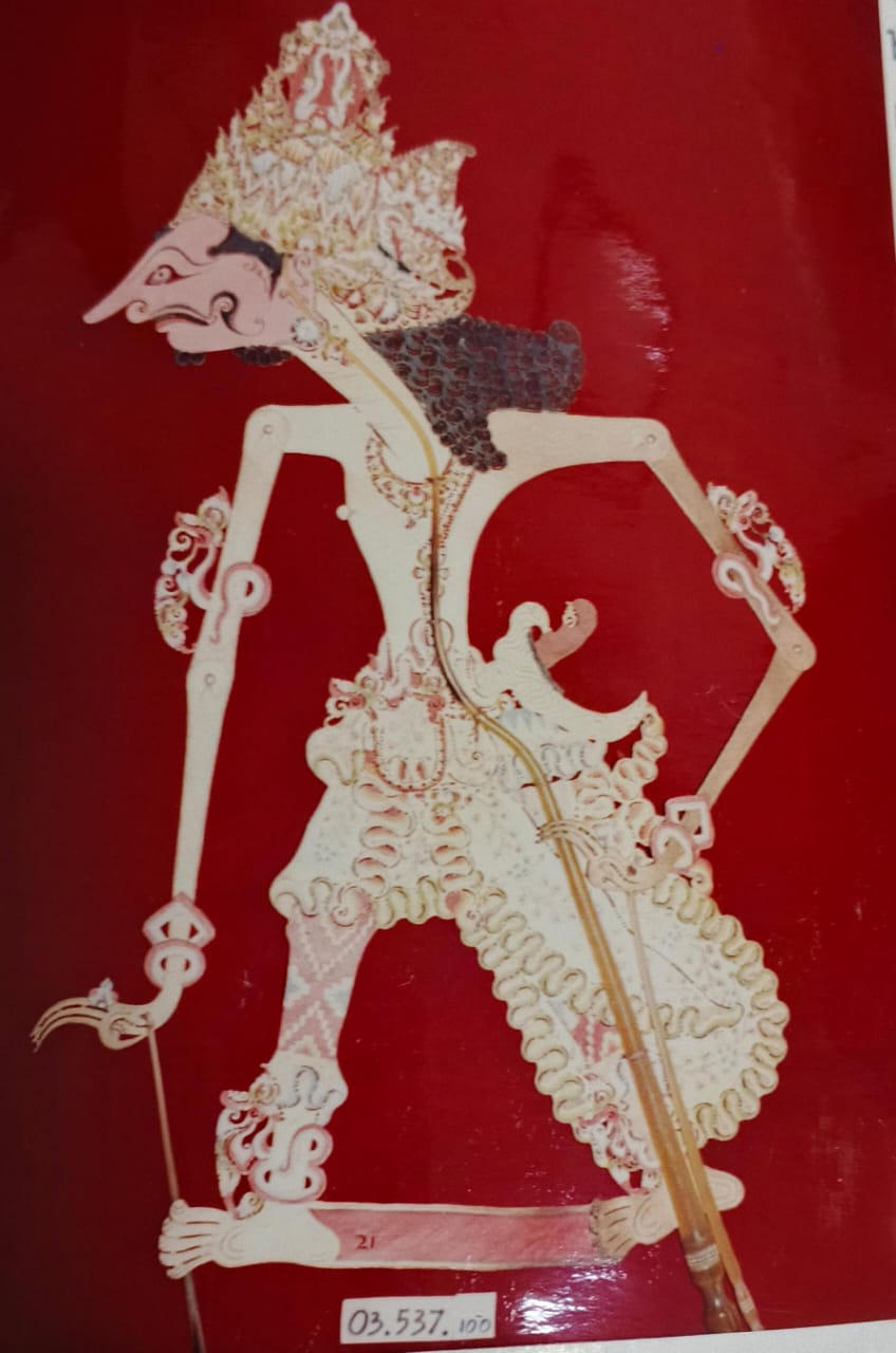 Benda ini terbuat dari kulit penyu. Berwarna coklat, merah, putih, biru, kuning. Berambut gembel bermahkota, hidung mancung, berjenggot tipis, celana panjang dan bersenjatakan keris.