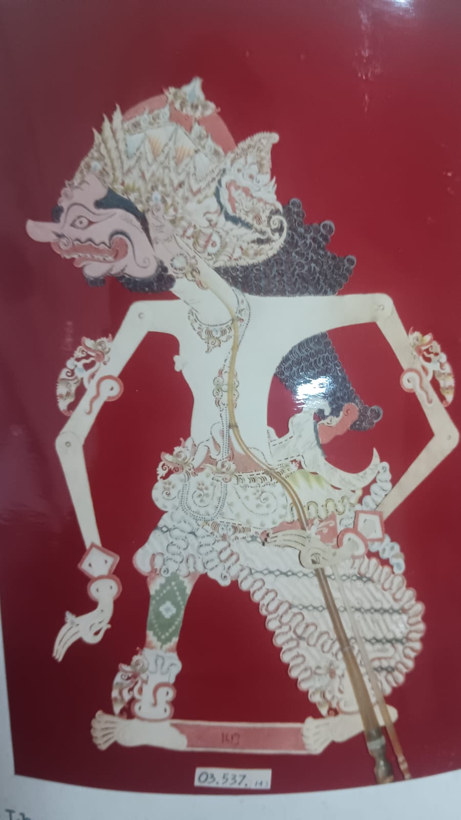 Benda ini terbuat dari bahan dasar kulit, berwarna coklat.kuning, putih, hitam-biru, hijau. Rambut-panjang memakai -kuluk, hidung besar. berjenggot tebal. celana panjang, jarik lereng, bersenjata -keris.