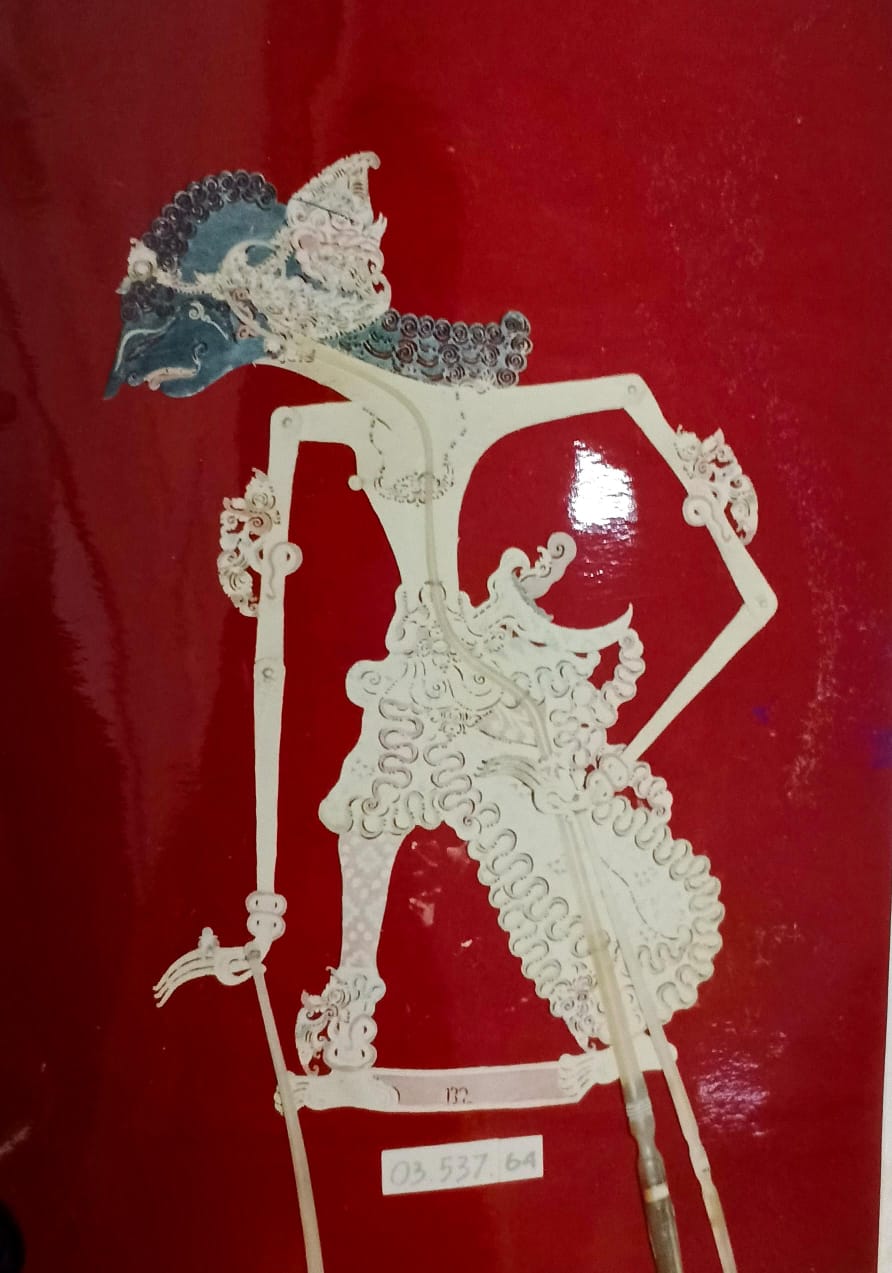 Benda ini terbuat dari kulit penyu, berwarna coklat, merah, putih, biru, kuning, mancung, muka hitam, rambut panjang bersenjatakan keris.