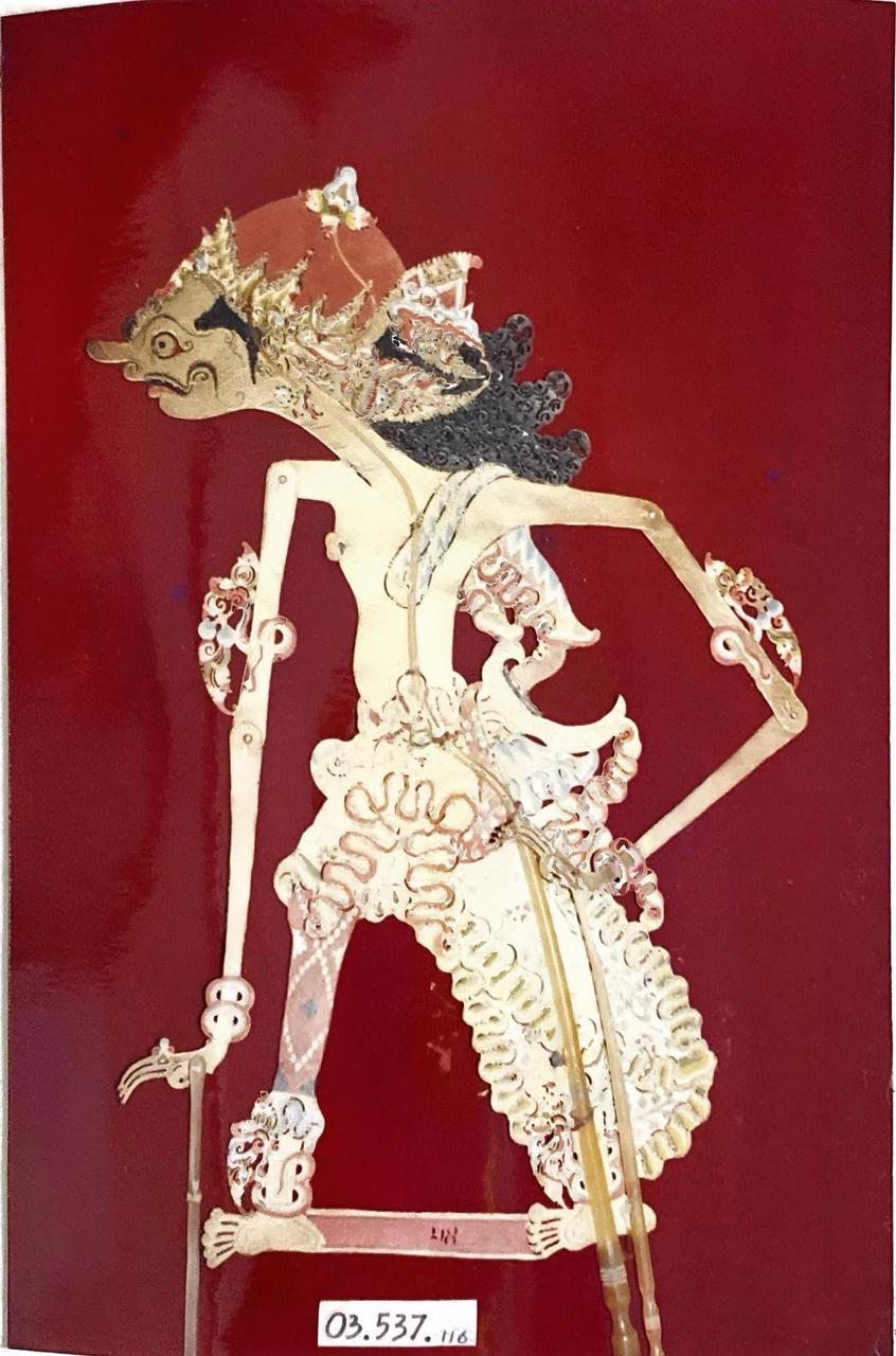 Benda ini terbuat dari bahan dasar kulit, berwarna coklat merah, putih, biru, hijau orange. Rambut gimbal, memakai kuluk, hidung besar, celana panjang, bersenjata keris.