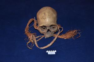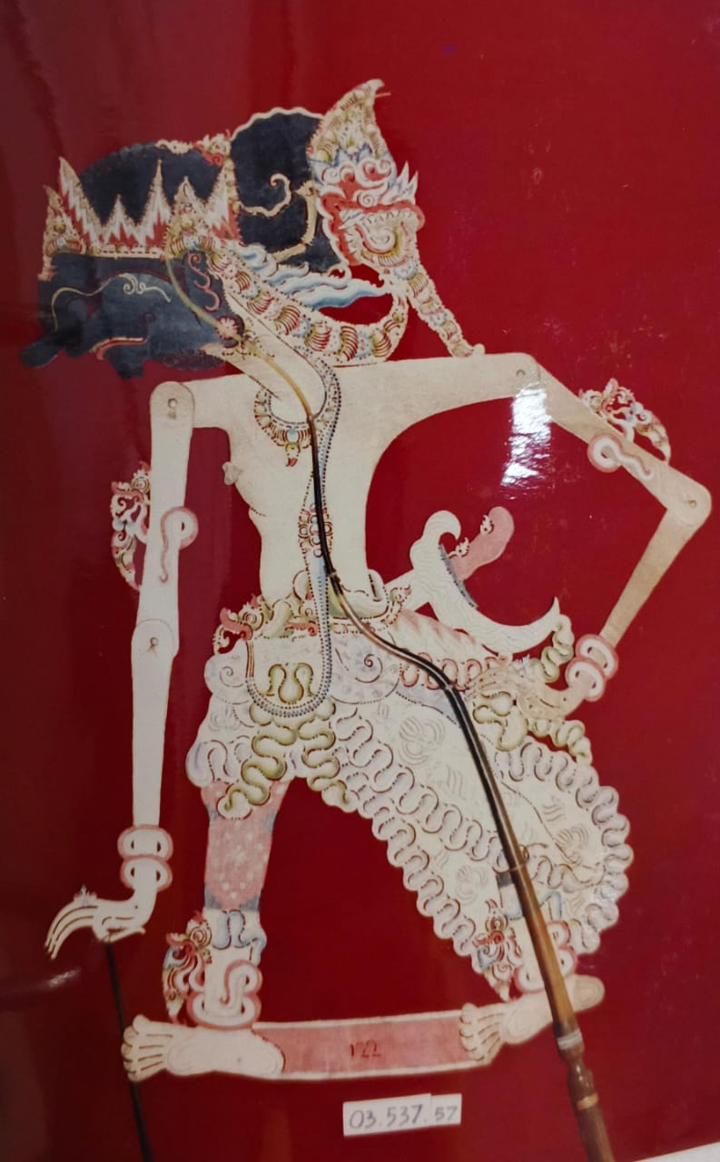 Benda ini terbuat dari sebatas perut kebawah bahan dasar kulit dari penyu, berpakaian warm hitam, hijau, kuning, merah, ungu, merah. Berjenis kelamin pria bermuka hitam menggunakan badeng, kelat bahu, bersenjata keris.