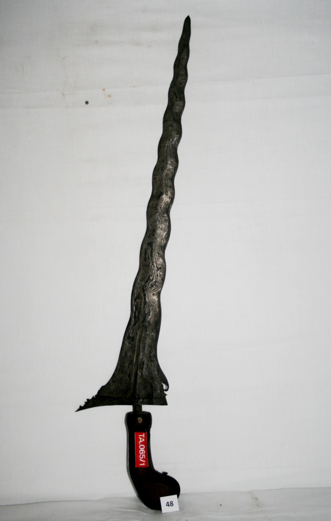 Benda ini terbuat dari kulit penyu. Berwarna coklat, merah, biru, kuning, hijau. Berambut gembel, memakai sumping, hidung besar, gigi bertaring, tangan satu, memakai celana panjang dan jarit lereng.