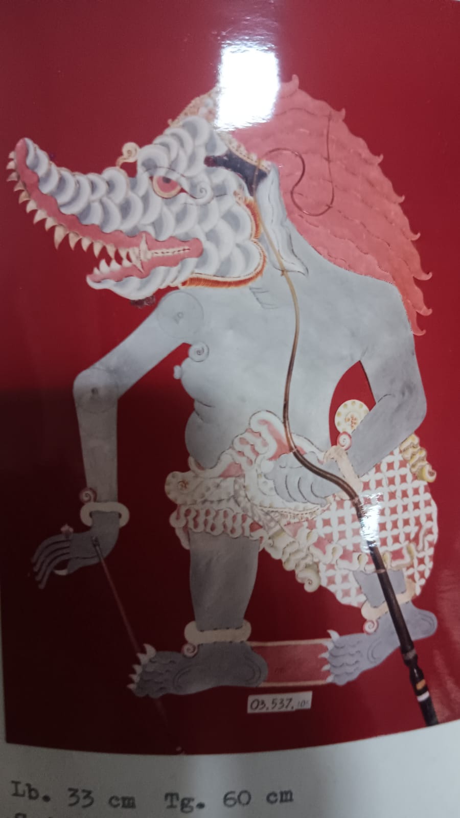 Wayang kulit ini terbuat dari kulit penyu. Berwarna coklat, merah, hitam, putih, hijau, rambut geni, wajah buaya, tangan satu, celama pendek dan jarit lareng.