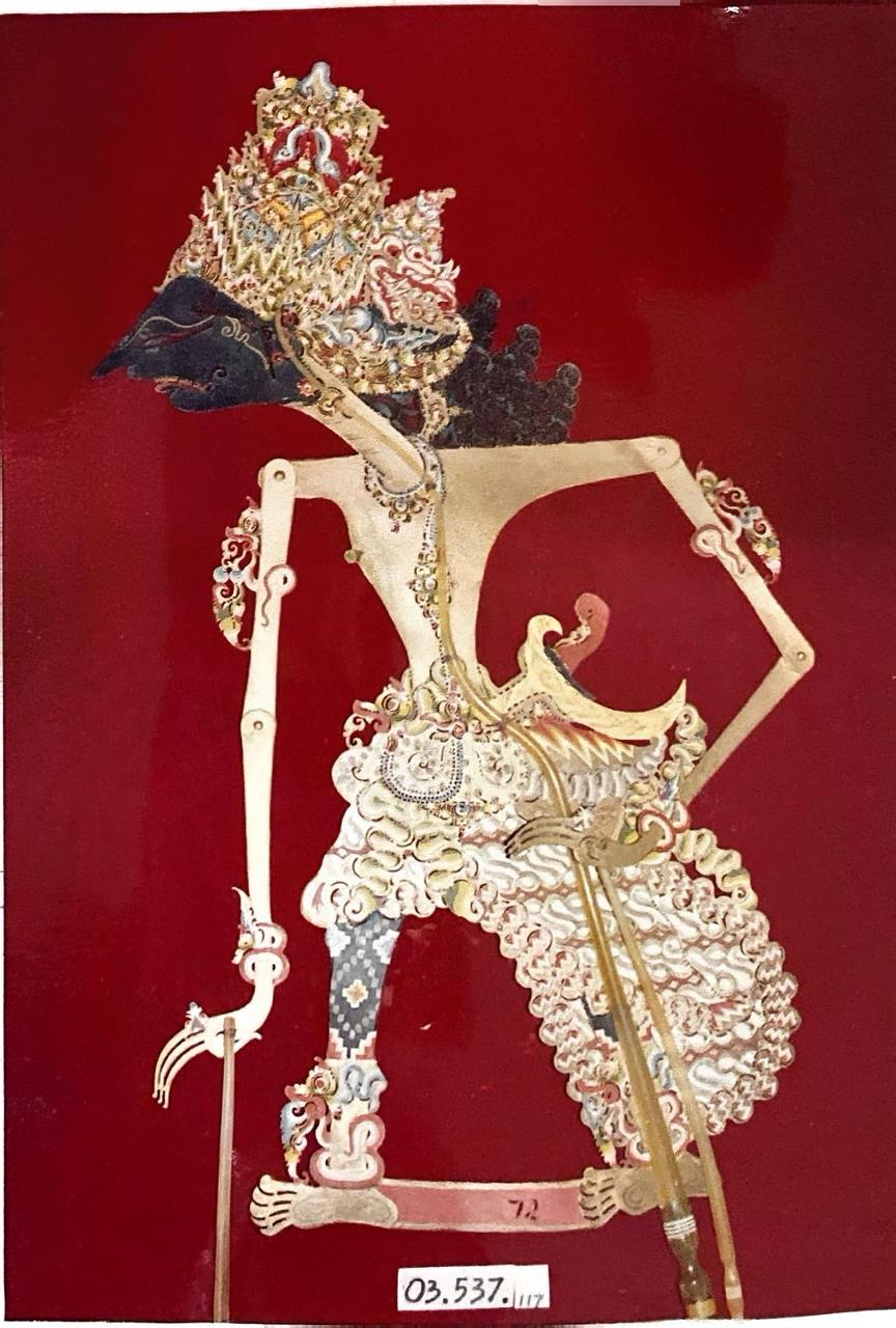 Benda ini terbuat dari bahan dasar kulit. berwarna coklat merah, putih, hijau, hitam. Rambut gimbal, bermahkota, hidung mancung, wajah hitam, celana panjang, jarik lereng, bersenjata keris.