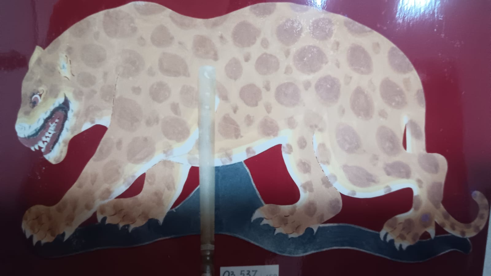 Benda ini terbuat dari bahan kulit, berwarna pütih, kuning,-orange, hitam, ekor -panjang, mulut mau -menerkan.