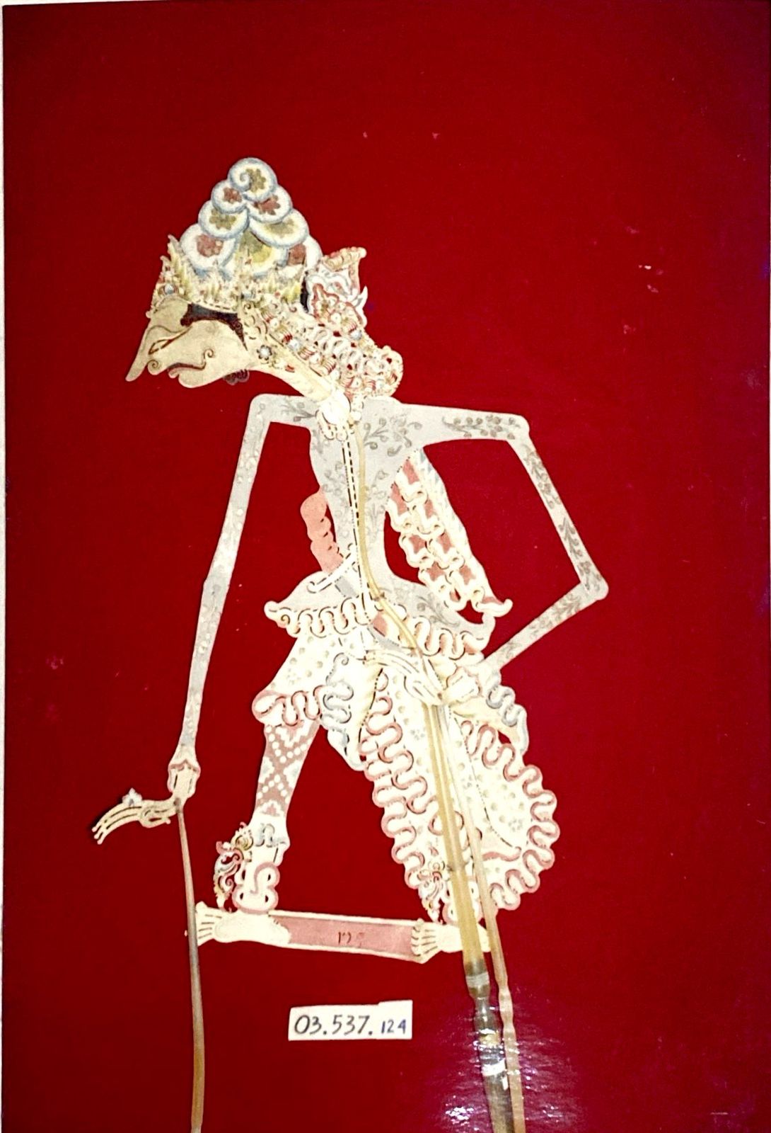 Benda ini terbuat dari bahan dasar kulit, berwarna ungu, merah, putih, biru. Rambut digelung, memakai surban, hidung mancung. Baju sembagi, celana panjang. Bersenjata pedang terselip didepan.