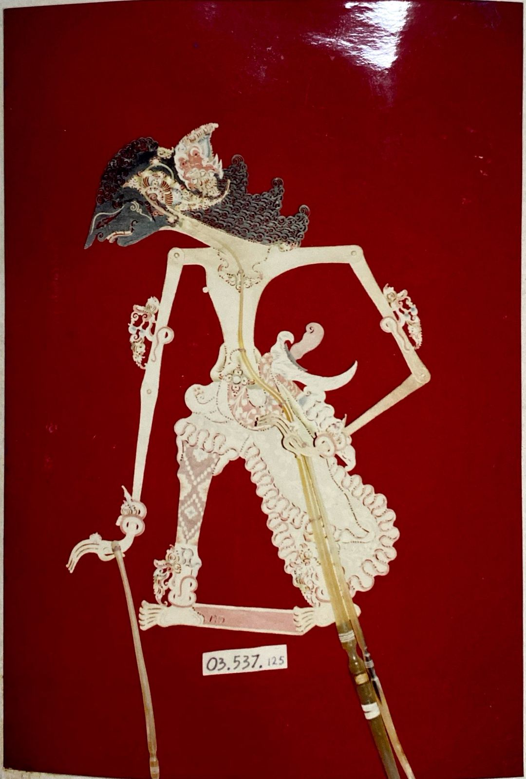 Benda ini terbuat dari bahan dasar kulit, berwarna coklat, merah, hijau, putih, biru. Rambut panjang gimbal, hidung mancung, wajah hitam, celana panjang, bersenjata keris.