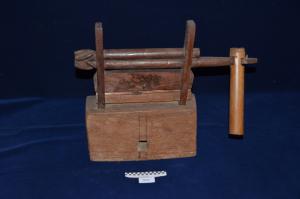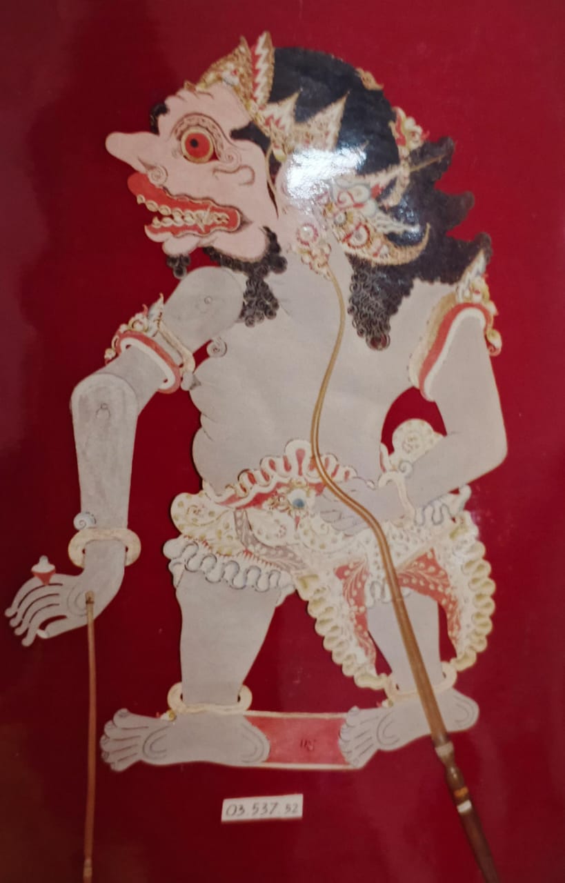 Benda ini terbuat dari bahan dasar kulit, berwarna coklat, ungu, merah, putih, biru. Rambut gimbal, hidung besar, muka seran, badan besar, celana pendek, tangan satu