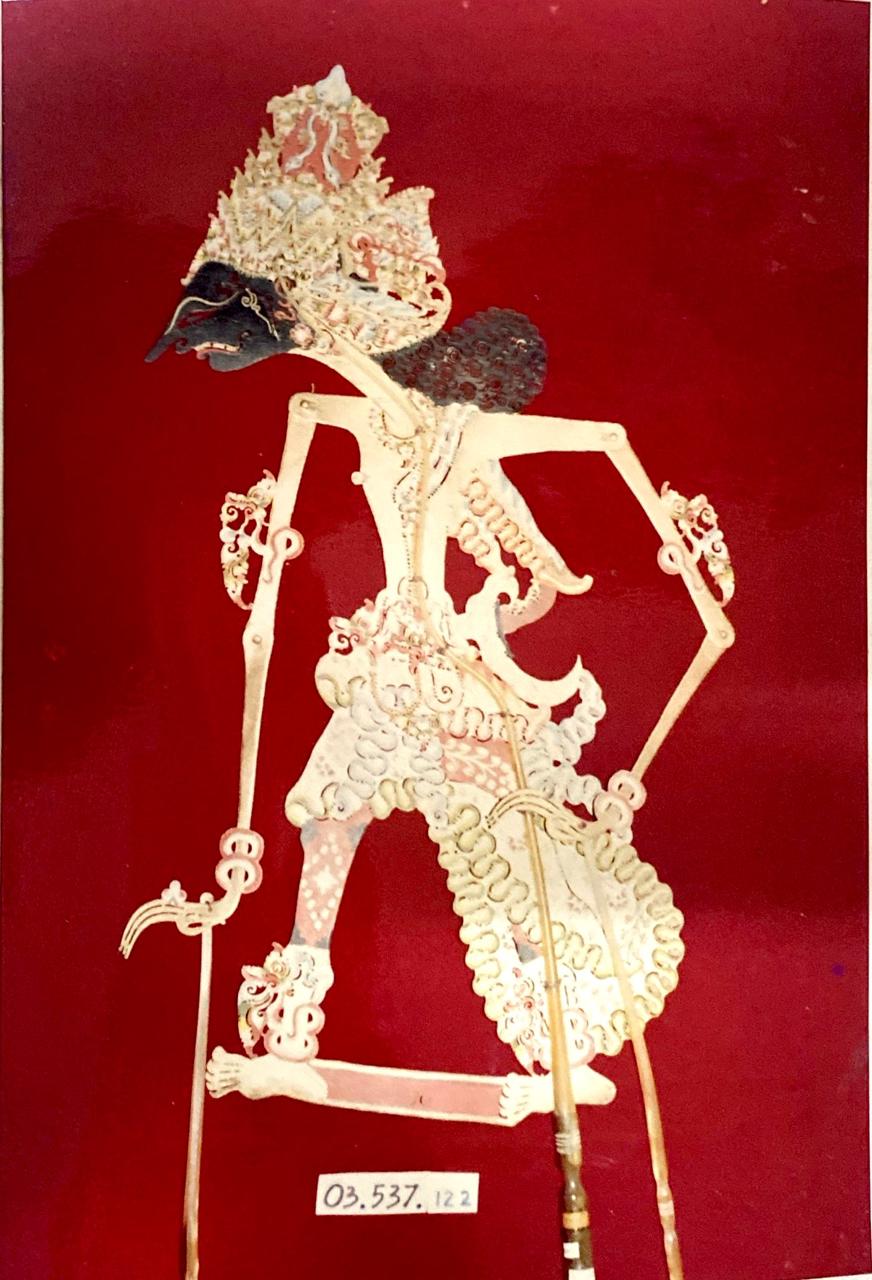 Benda ini terbuat dari bahan dasar kulit, berwarna coklat biru, putih, hijau, merah, hitam. Rambut panjang memakai mahkota, hidung mancung, muka hitam. Celana panjang. Bersenjata keris.