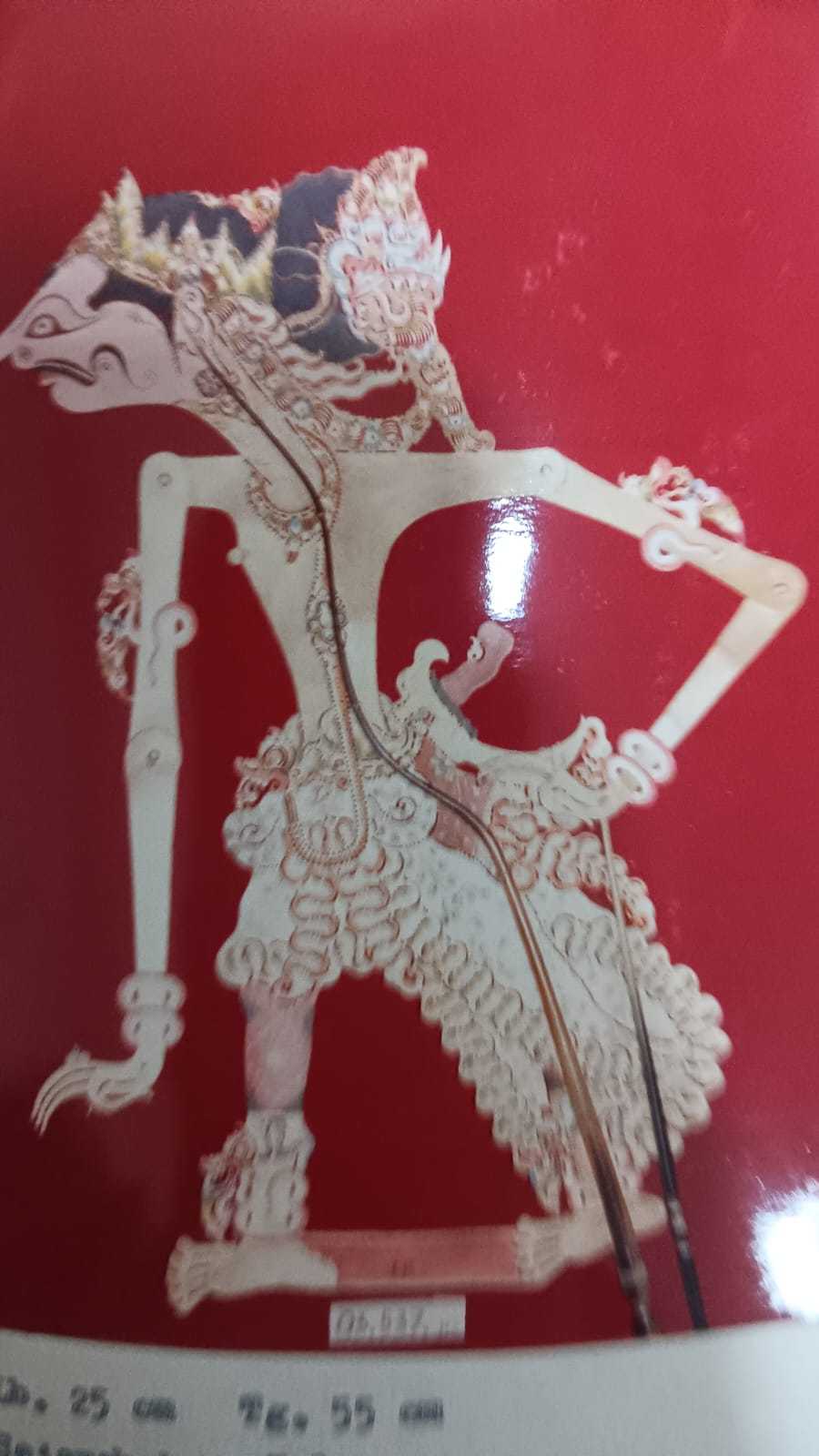Jenda ini terbuat dari kulit penyu, Berwarna coklat, oranje, merak, Rambut gelung, hidung Rancung, celana panjang, bersenjata.